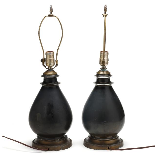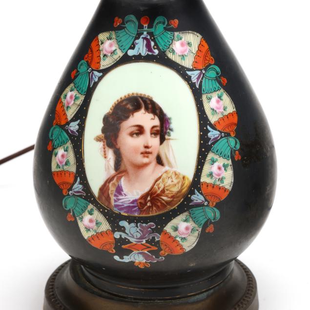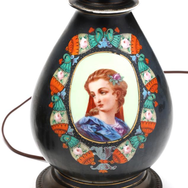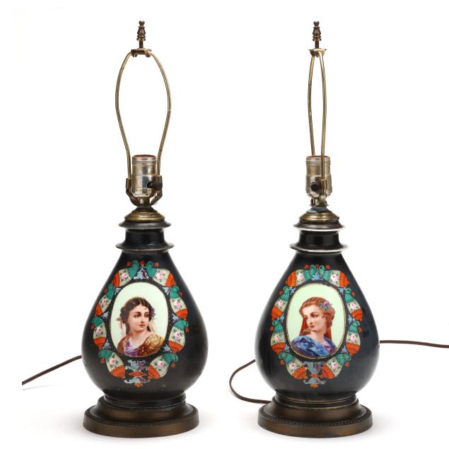 Late 19th to early 20th century, porcelain vases with matte black finish decorated with hand-painted portraits of ladies surrounded by paisley frame, now wired as table lamps with brass finished metal mounts, unmarked, includes two pleated silk lined shades, metal harps, and finials.