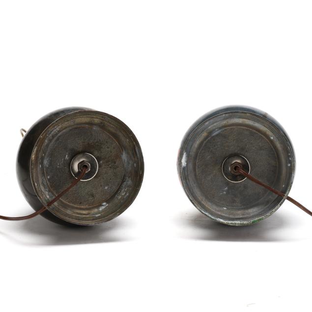 Working at time of evaluation; small scattered areas of wear and surface marks to paint and gilt; area of restoration to neck of one vase; one shade with small area of staining; areas of verdigris to mounts.