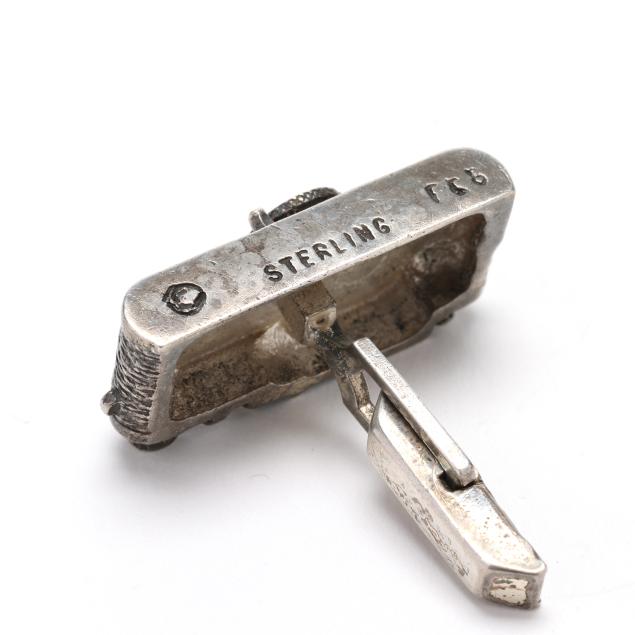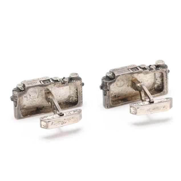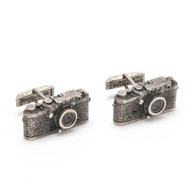 The silver cufflinks in the form of a camera, completed with toggle backs, signed and stamped Sterling.