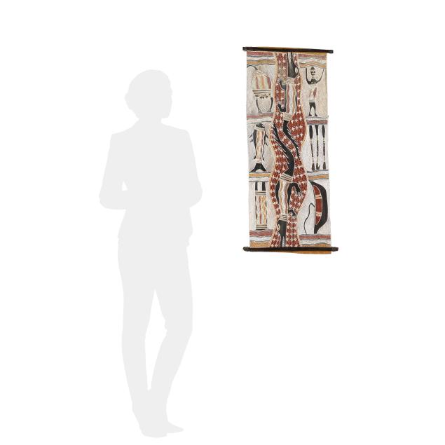 Aboriginal Australian bark paintings are a long-standing artistic and cultural practice, particularly associated with communities of northern Australia such as Arnhem Land. Painted on sheets of eucalyptus bark using natural mineral ochres, these works are grounded in ancestral law, country, and kinship systems rather than personal expression alone. The imagery, which ranges from figurative depictions of ancestral beings and animals to highly structured geometric patterns, communicates stories of creation, land ownership, and ceremonial knowledge. Bark paintings function as visual archives of Indigenous knowledge, carrying cultural authority and serving as a means of teaching, maintaining, and asserting connections to land across generations.
