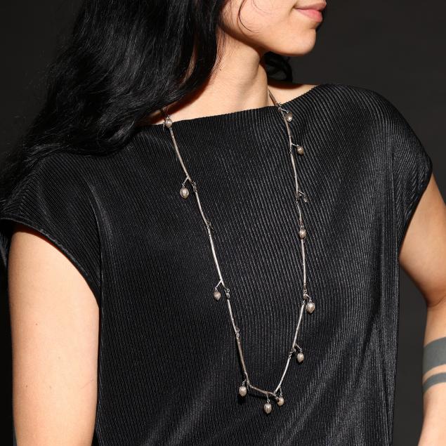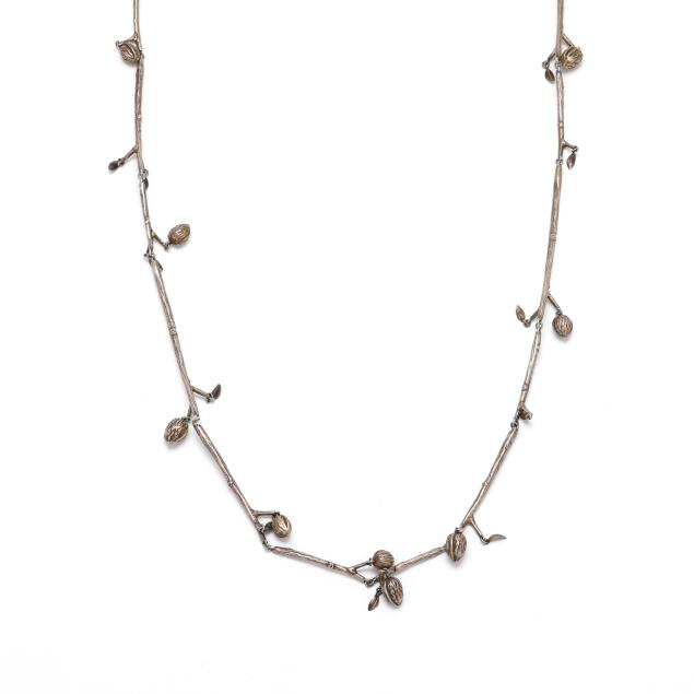 The faux bois necklace with twig links, suspending leaves and nuts, appears unsigned, XRF testing 95% silver.