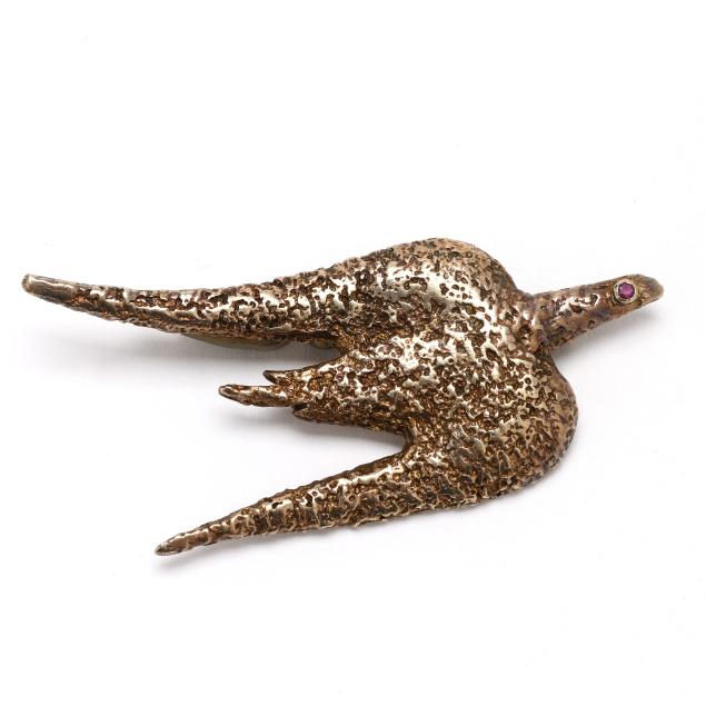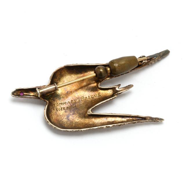 The textured vermeil brooch in the form of a bird in flight, in tribute to Georges Braque, set to the eye with a round cut ruby, completed with a locking pin stem, signed and with French maker's mark and hallmark for silver.