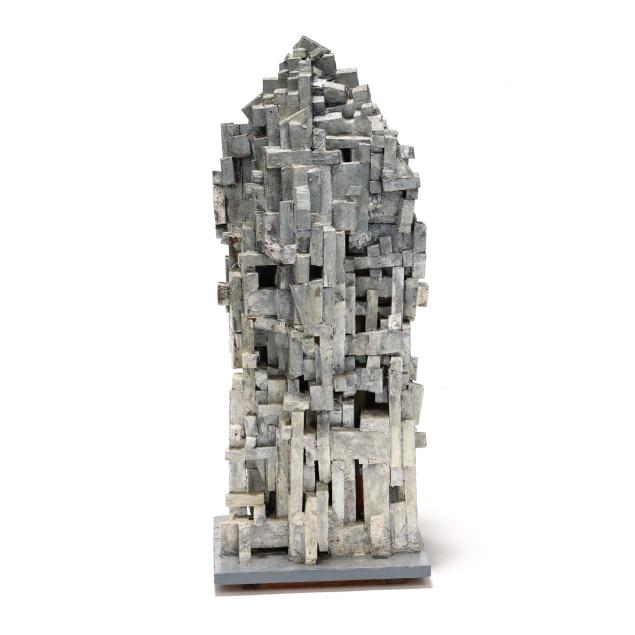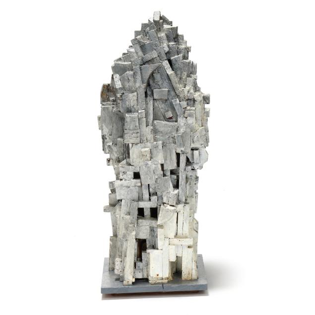 1965, cubist wood assemblage painted in a gradated white/gray, pencil signed, dated and titled to the underside.