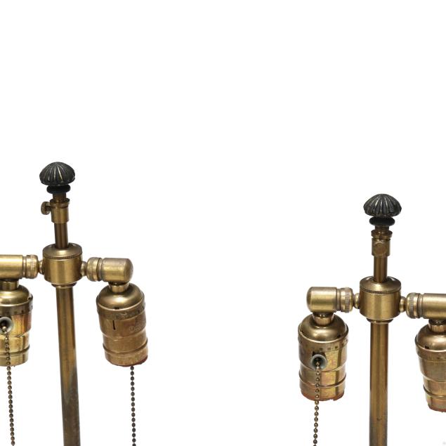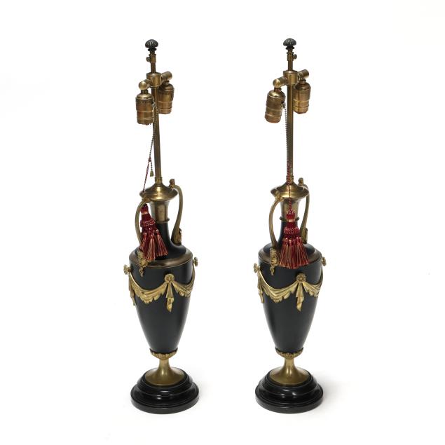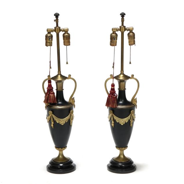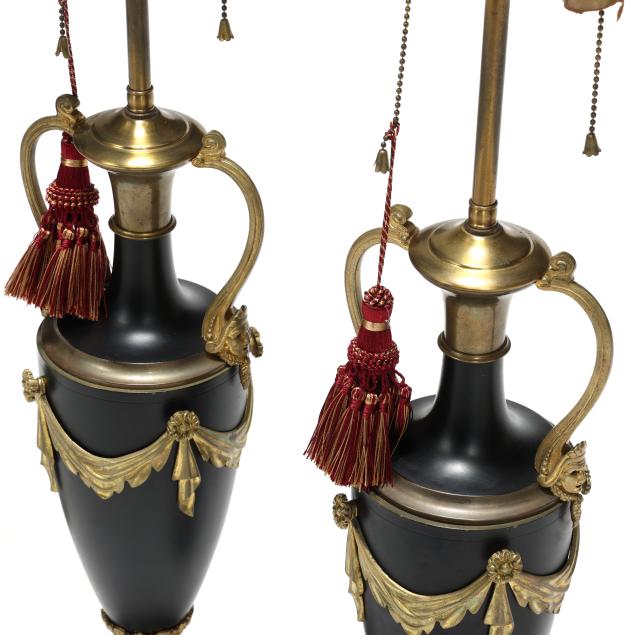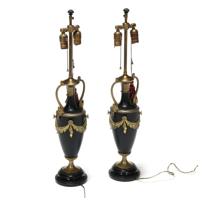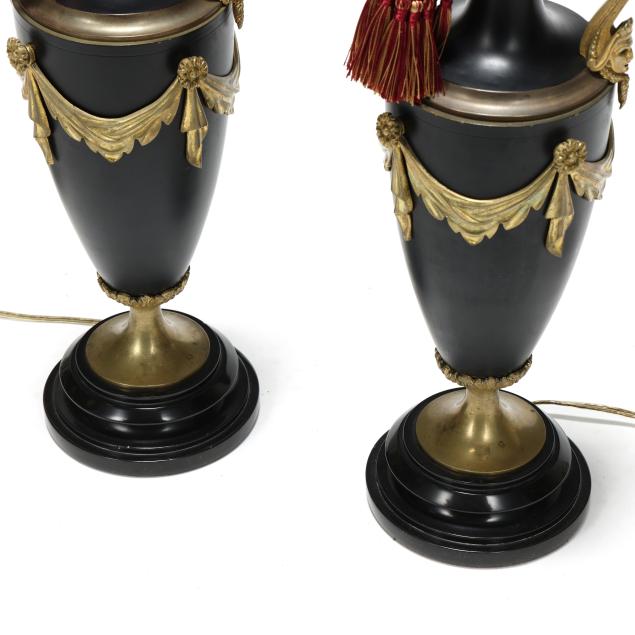 Mid- to late 20th century, dual socket form lamps in form of two handled urn, with brass and gilt metal mounts, handles, and draped swag, each mounted to conforming black soft stone socle, unmarked, includes two black painted metal finials and silk lined shades.