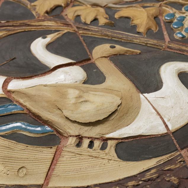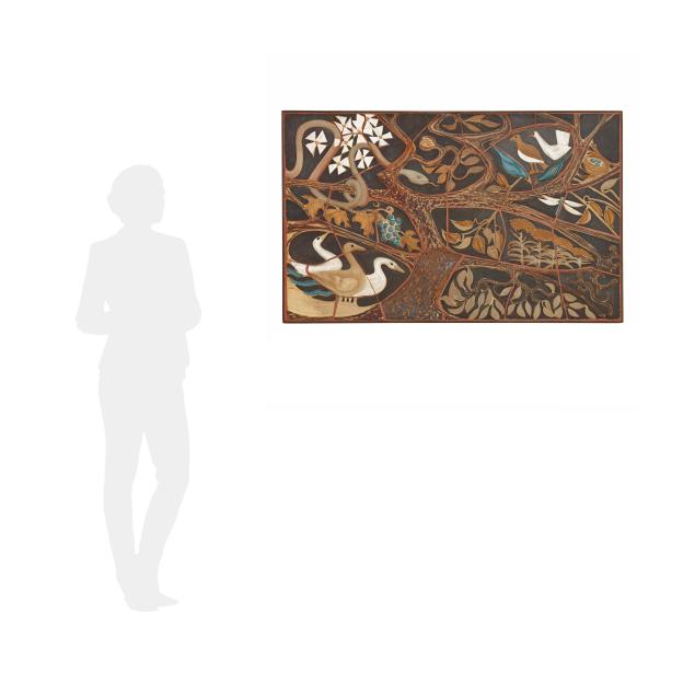 1970, handmade glazed ceramic tiles, signed and dated lower left, depicting various birds, a snake, and various flora vignettes within a tree, all against a umber field, presented within a custom heavy welded steel frame.