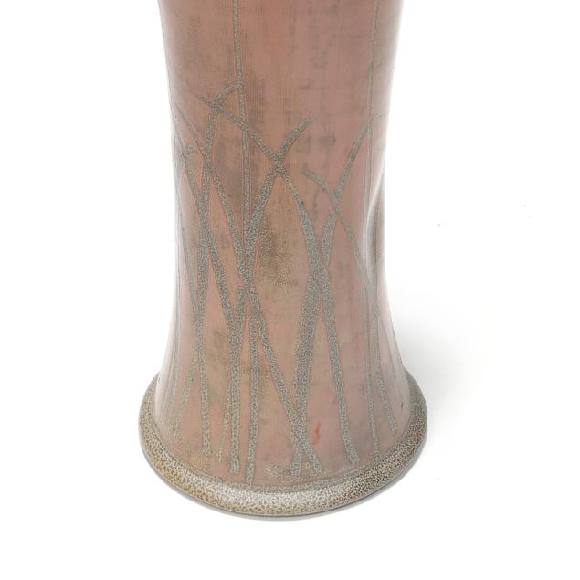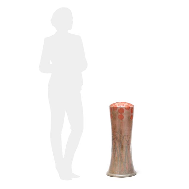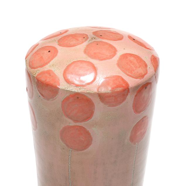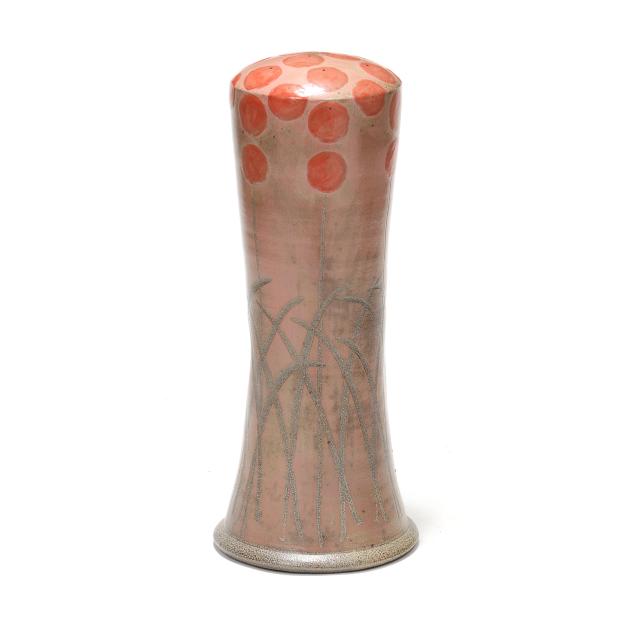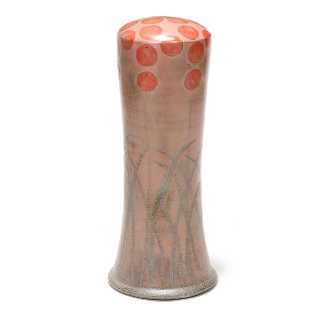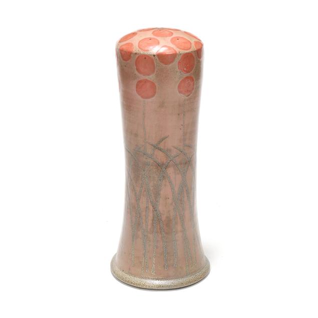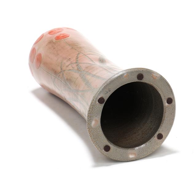 Pittsboro, salt glazed stoneware, signed with impressed 1995-present oval potters glyph and "90" for 90th firing to the underside, of waisted cylindrical form, pink glazed field with stylized poppy decoration.