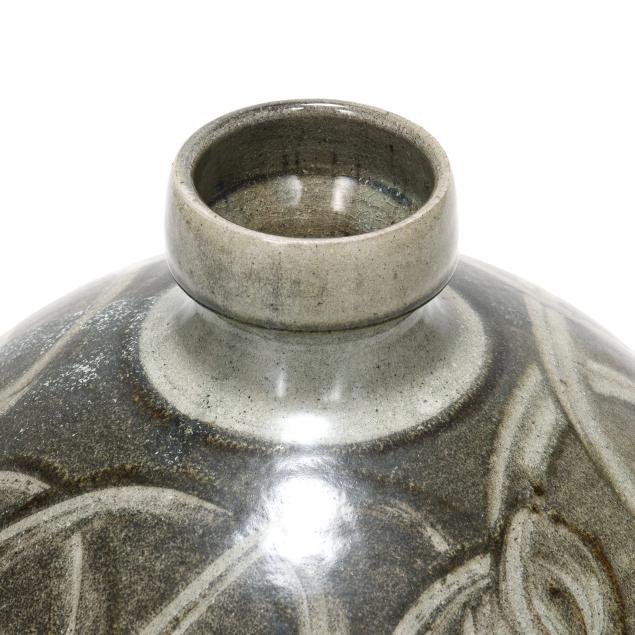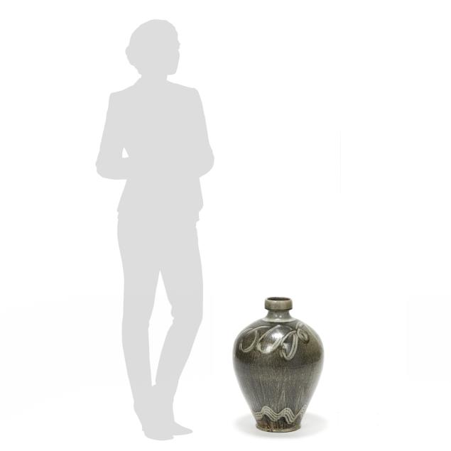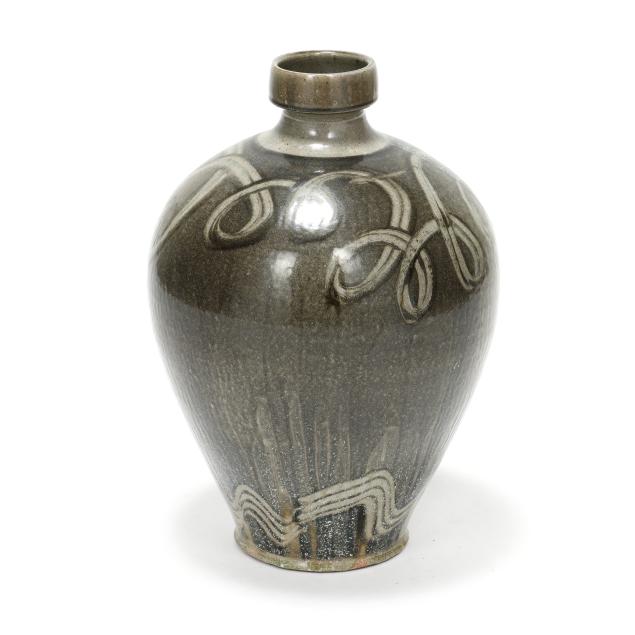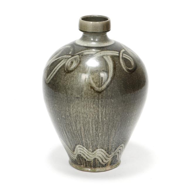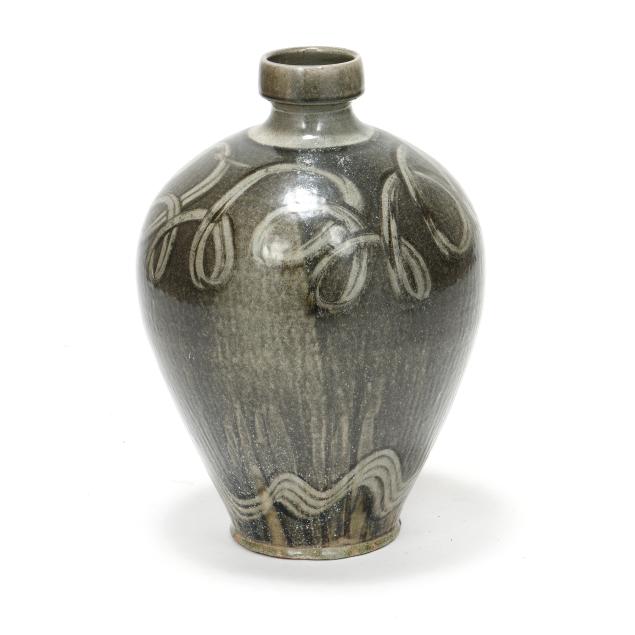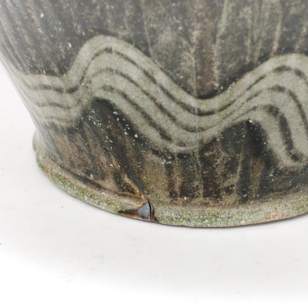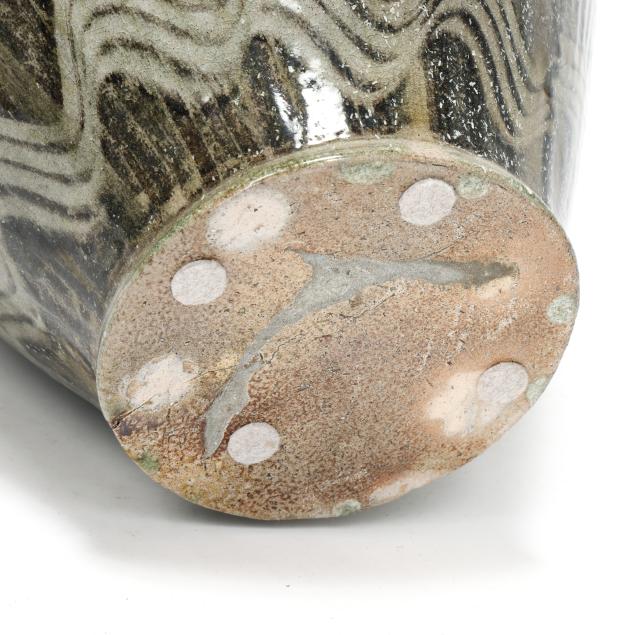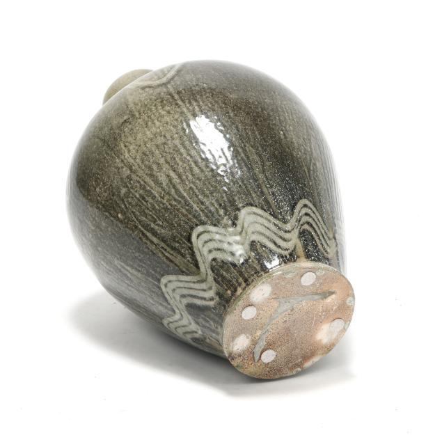 Pittsboro, signed with circa 1995-present oval potter's glyph and stamped "85" for 85th firing, ovoid body over a tapered round foot, beneath a cylindrical spout, decorated in runny dark gray glaze over a lighter glassy gray, with gestural curling motif to the shoulder and wavy motif near the base.