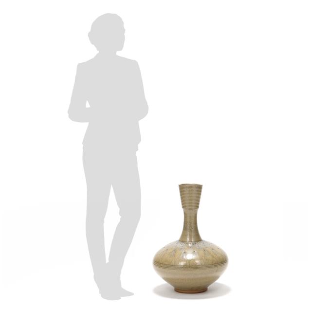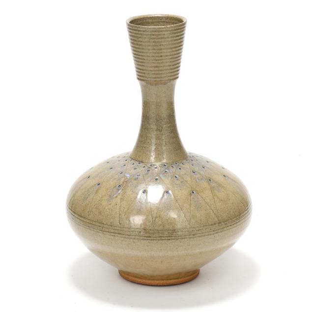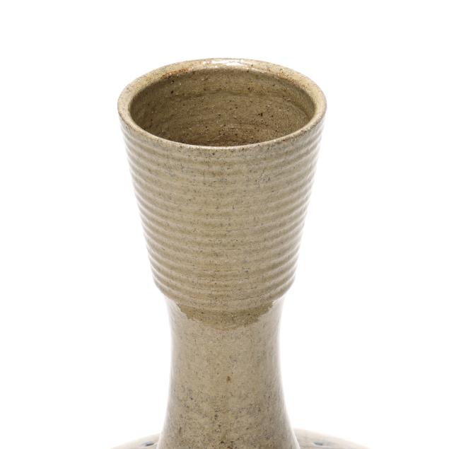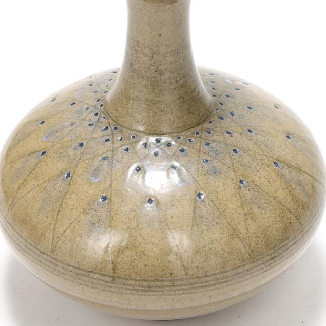 Pittsboro, salt glazed stoneware, signed with 1995-present oval potter's glyph, additionally stamped "H" for the new kiln record, squat bulbous body supporting a rising neck with ring tooled cup capital, the shoulder decorated with elaborate tooled geometric star pattern impressed with blue trapezoid accents.