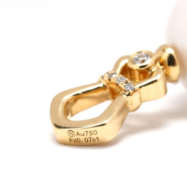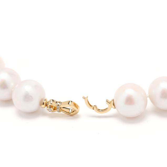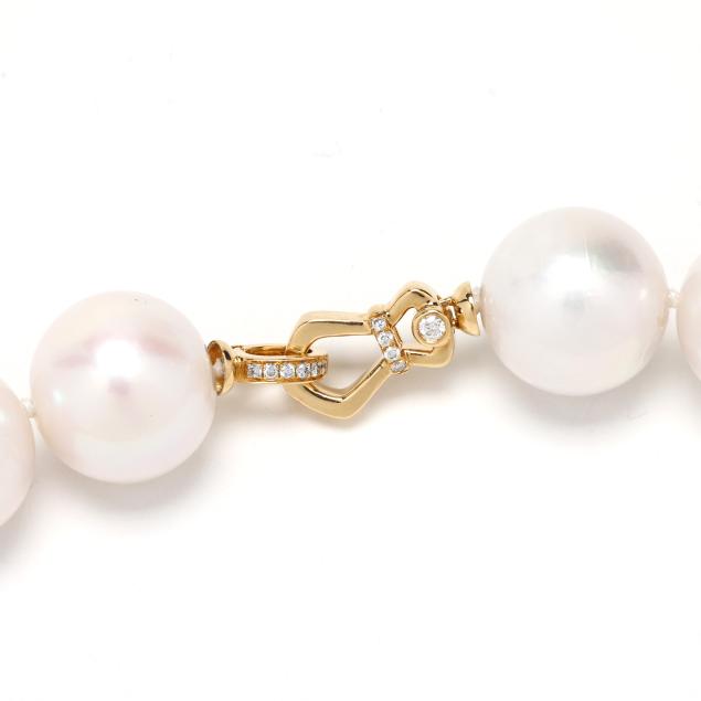 Strung knotted with (30) round cultured South Sea pearls (13.0mm to 16.0mm), completed with a gold hook clasp set with full cut round lab-grown diamond melee, stamped with a maker's mark and Au750 / Pd0.07ct