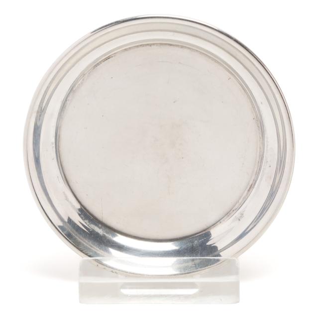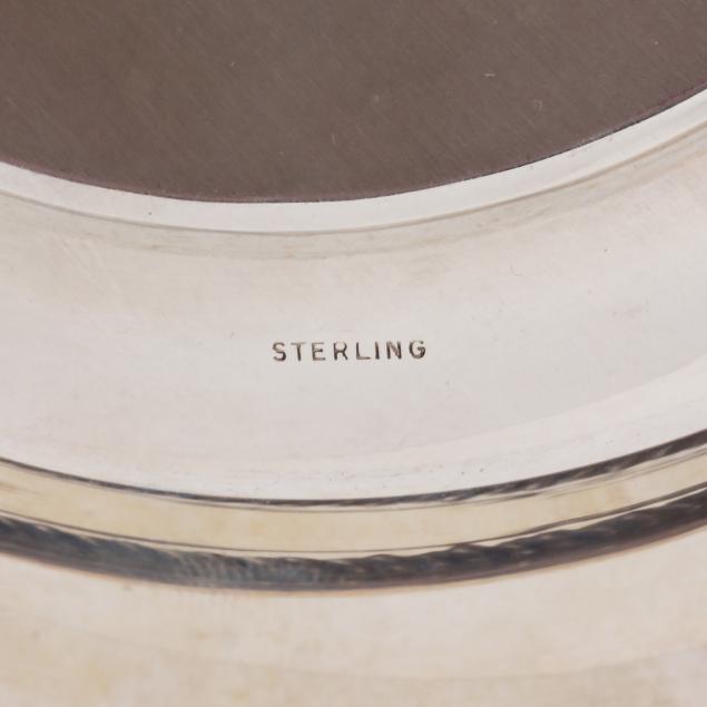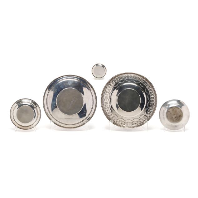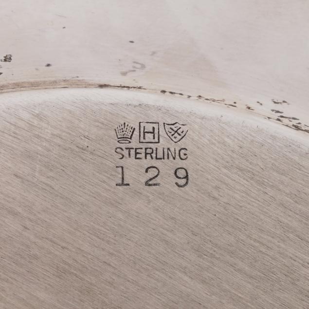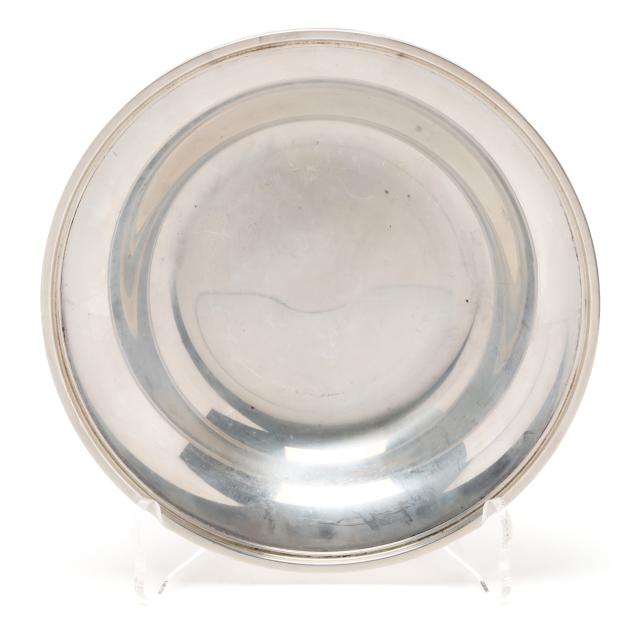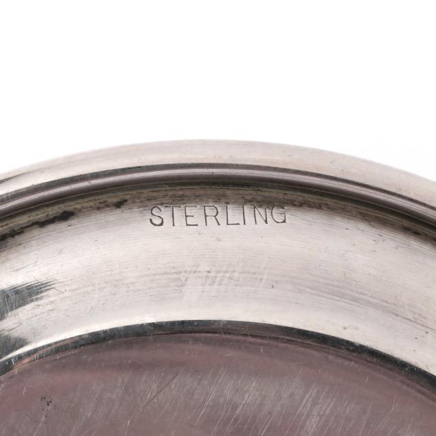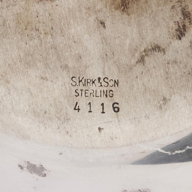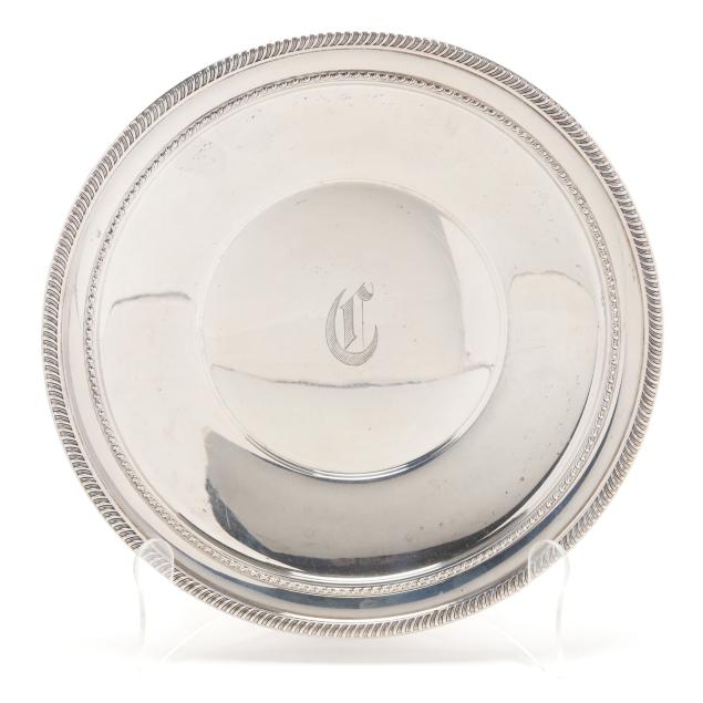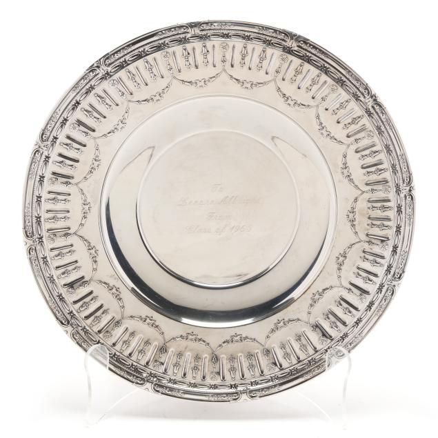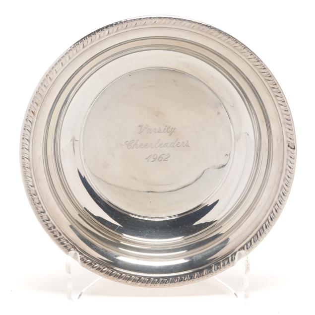 To Lenora Albright / From / Class of 1963 (10 in. dia.); a Fred Hirsch Co. sandwich plate with gadrooned edge and "C" monogram, pattern number 129 (9 5/8 in. dia.); a sterling bon bon bowl with gadrooned edge, engraved "Varsity Cheerleaders 1962"; and S. Kirk & Son bon bon bowl, pattern number 4116, and a sterling butter pat, not monogrammed.