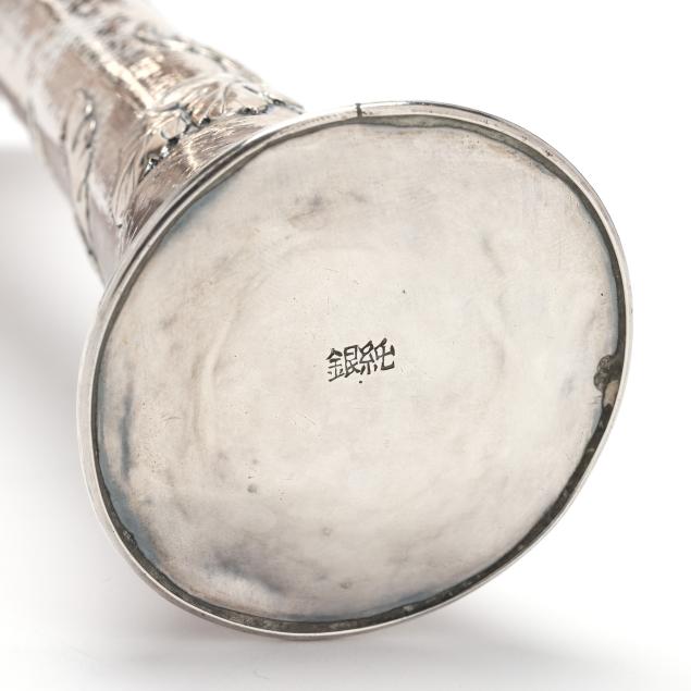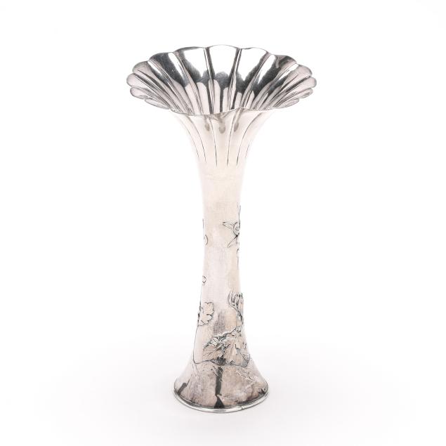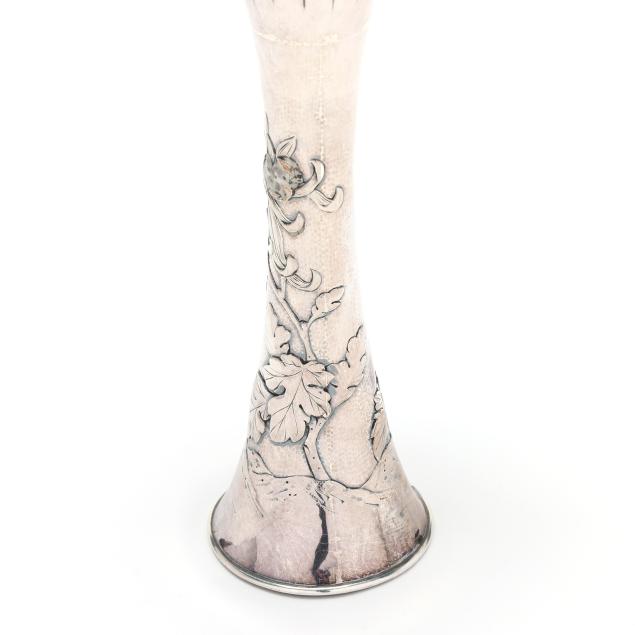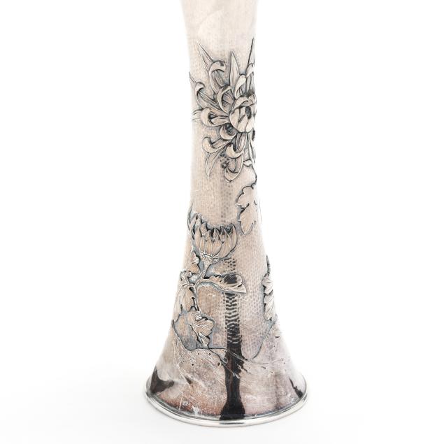20th century, featuring a hammered surface with repousse chrysanthemum and foliate designs, and a scalloped trumpeting rim, marked "Silver" to the underside in Japanese characters, XRF tests .950 silver content.