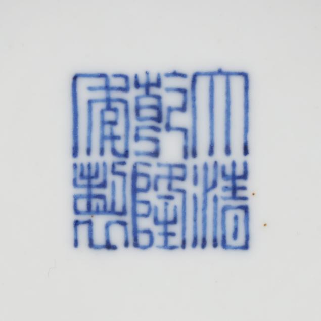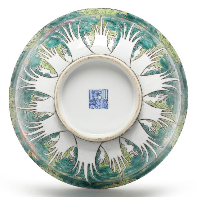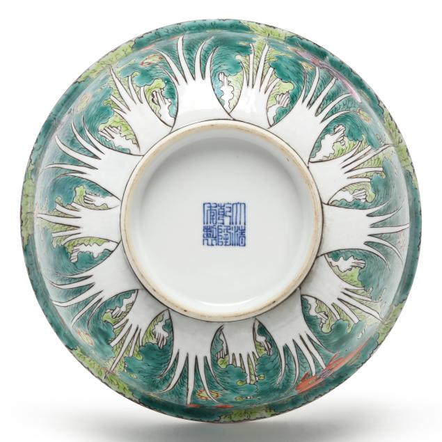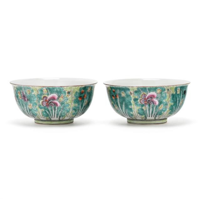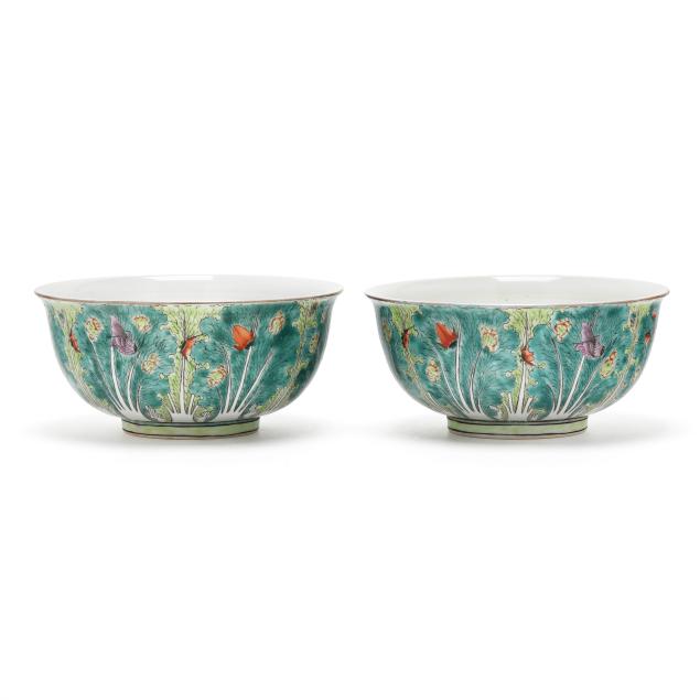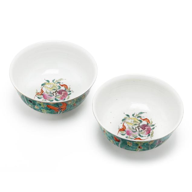 Mid- to late 20th century, porcelain decorated with cabbage leaf pattern with purple and iron red butterflies, the interior with three fruits and iron red bats, the underside of each with apocryphal six character Qianlong seal mark in underglaze blue.