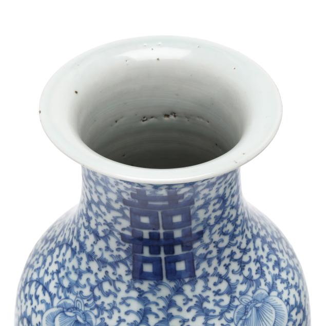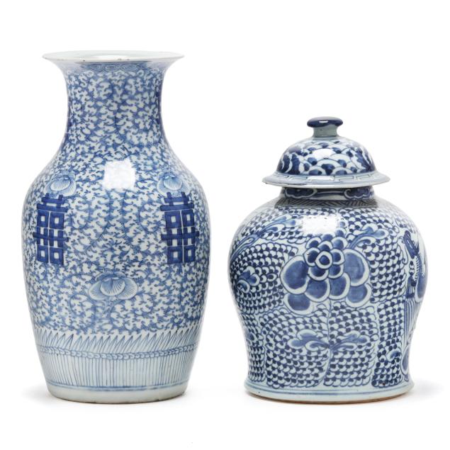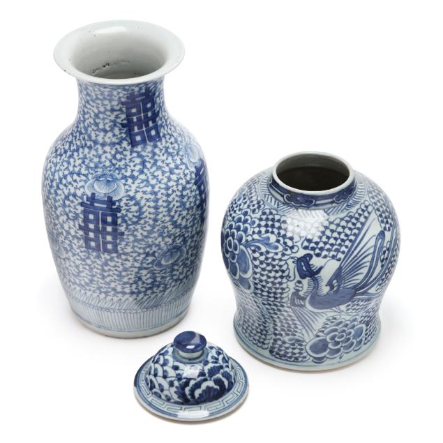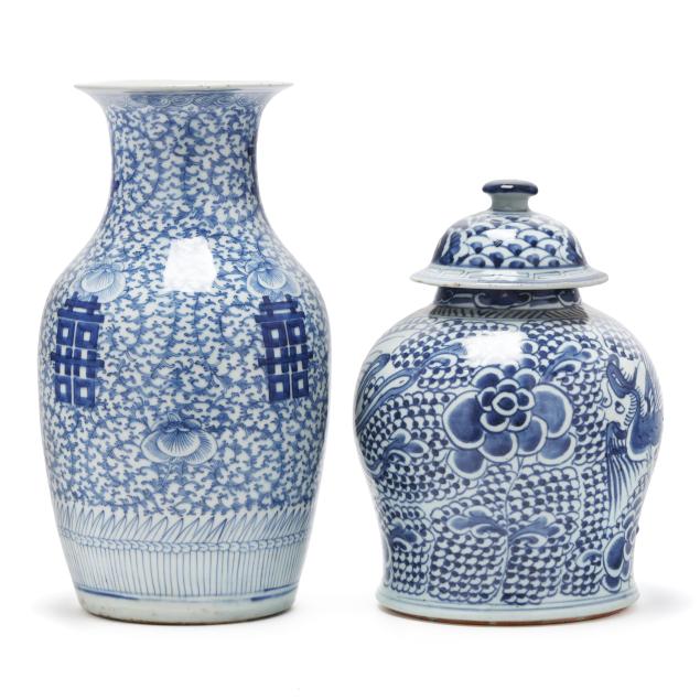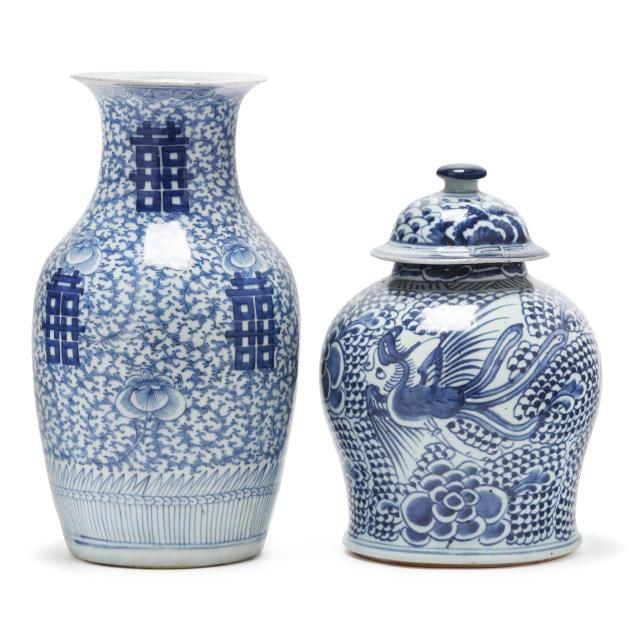 20th century, includes a jar with cover decorated in purplish blue with phoenix and peony blossoms, with domed cover, key motif encircling rim, unmarked (11 1/2 in., 9 1/4 in. diameter), and a tall porcelain vase with flared rim, hand painted in vivid blue with four double happiness symbols amidst peony blooms and scrolling tendrils, unmarked (14 in., 9 in. diameter).