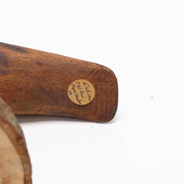 Original paint worn to bare wood in most places, tight and stable age check in the right side, remnants of early Sotheby's tag on the right side.