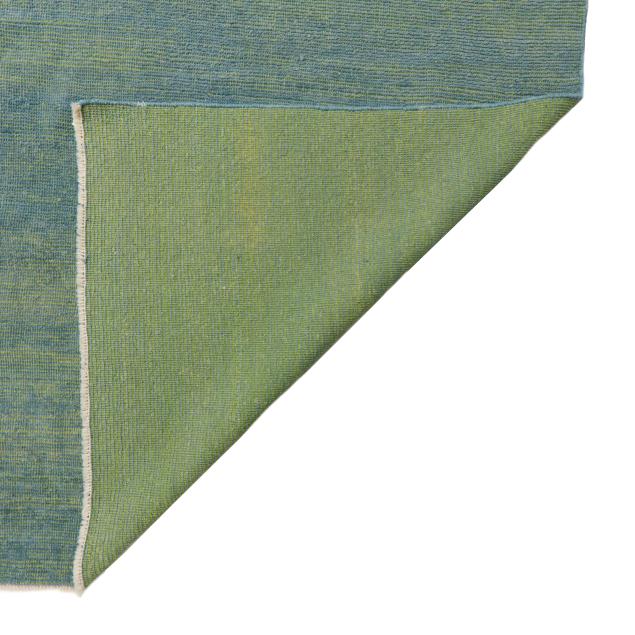 Wool and sisal, the green sisal foundation with rows of very low blue wool pile, with blue selvages, off white wool fringe ends.