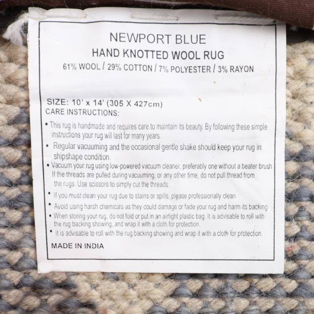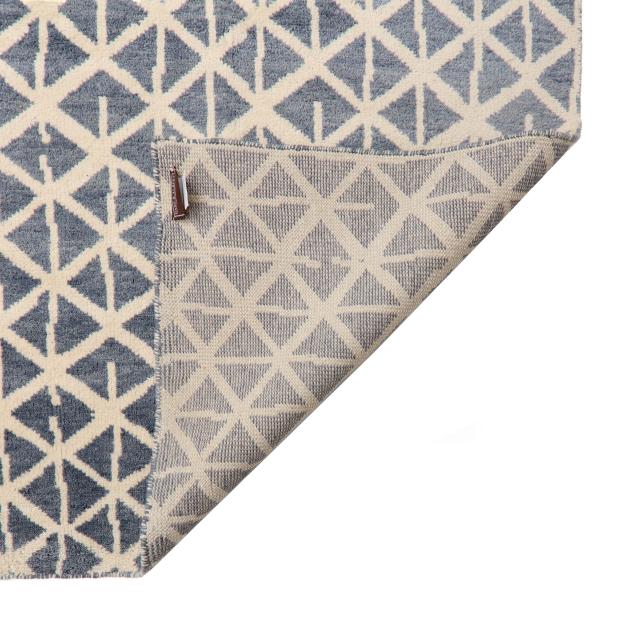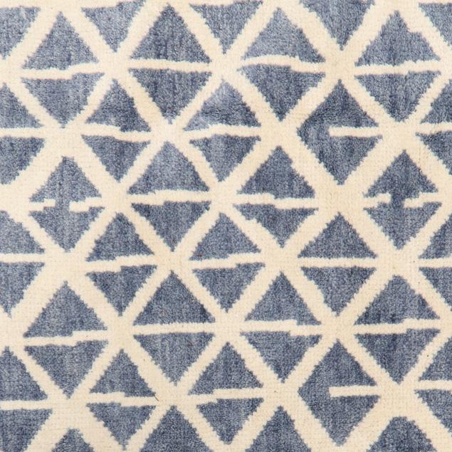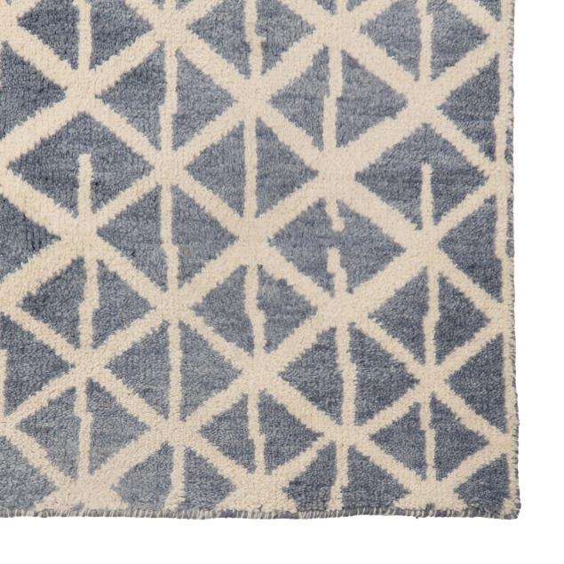 Wool, cotton, polyester, and rayon blend, India, the blue field with ivory geometric diamond lattice pattern, labeled to verso "Dash & Albert / an Annie Selke Company."