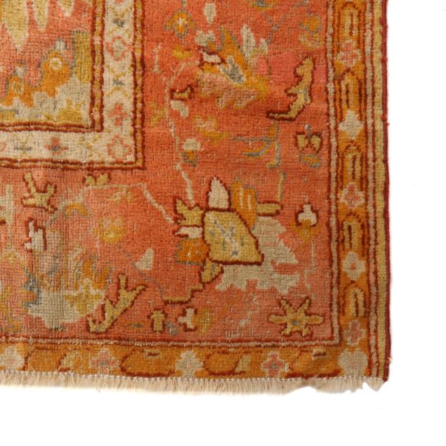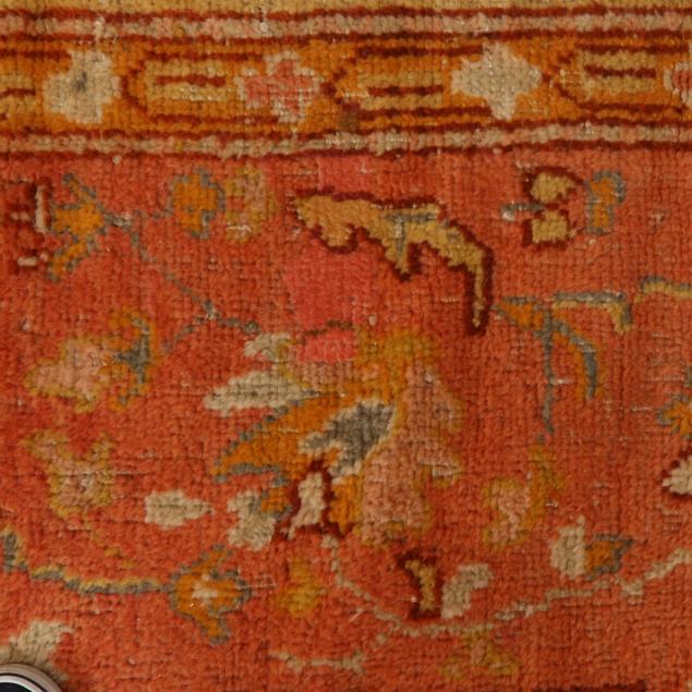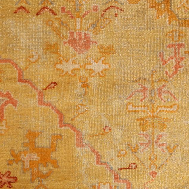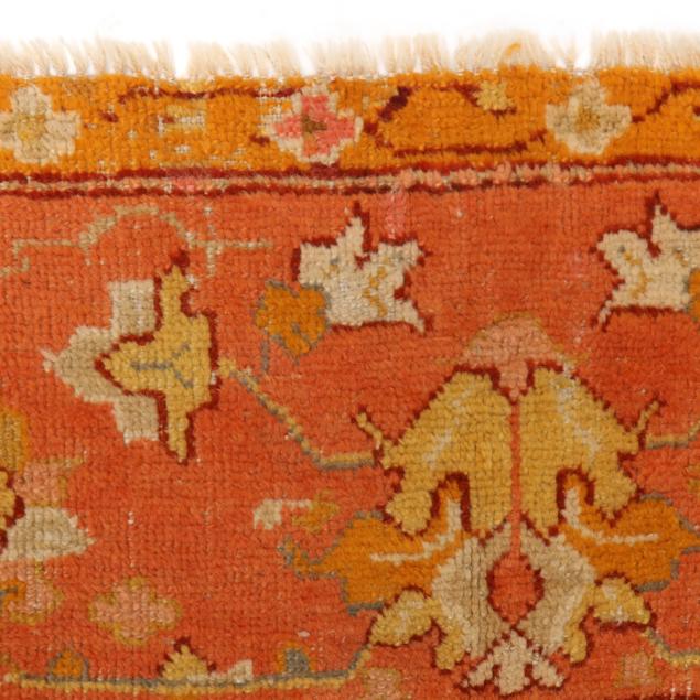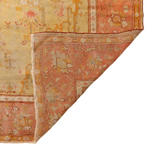 Wool on wool foundation, first half 20th century, the mustard field with orange, pink and grey-blue highlights, the salmon border with stylized palmette motifs, fringe ends.