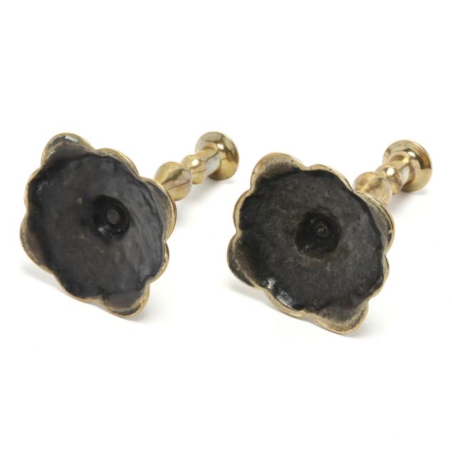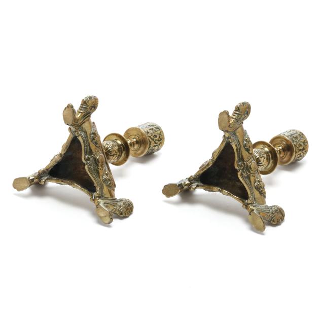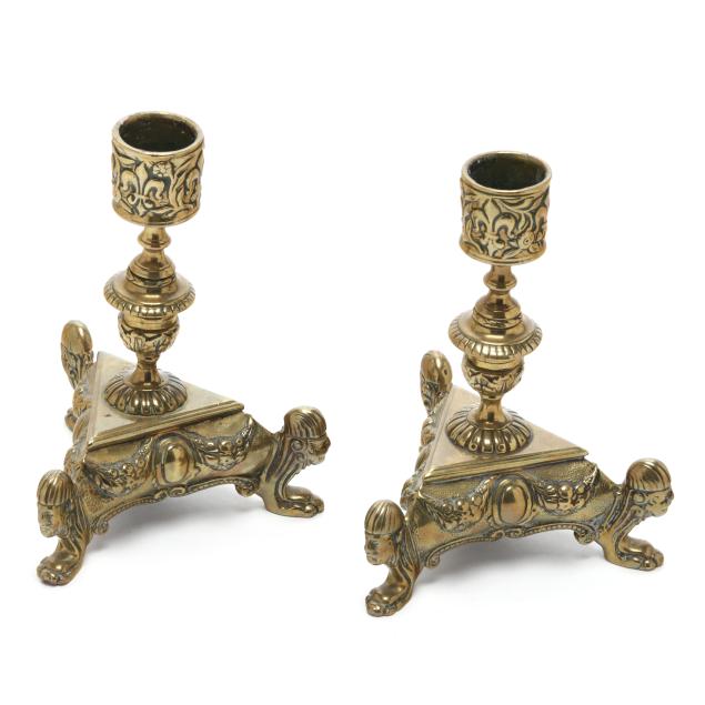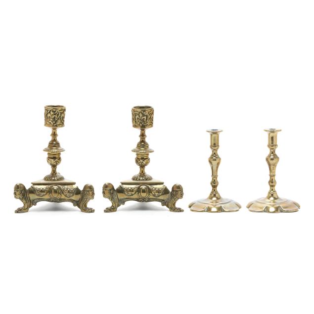 The first a pair of George II tapersticks, circa 1740, solid cast with threaded connection to the petal base (4 1/2 x 3 x 3 in.); the second a pair likely French, 19th century or earlier, featuring tripodal base, crouched legs with mask knees over paw feet, supporting ornate urn stem with fleur-de-lis relief cast nozzle (6 x 4 1/2 x 4 1/2 in.).