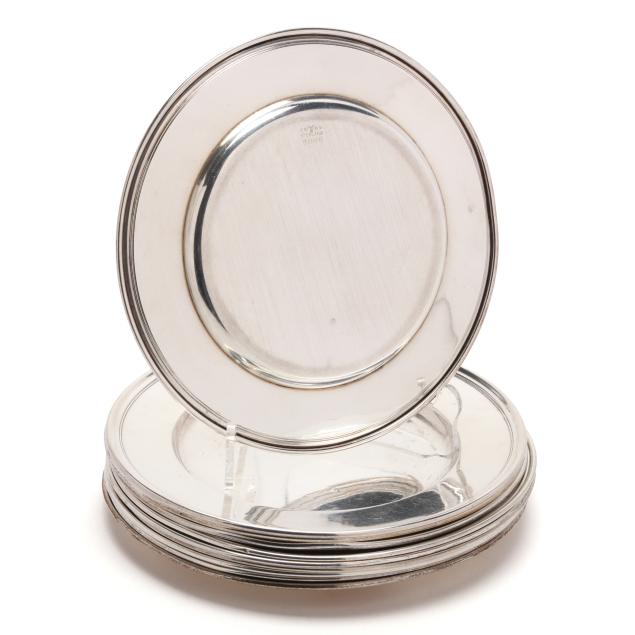 Includes: (6) with mark of Meriden Brittania Co., pattern number 696; and (4) with mark of Wallace, pattern number 2899, all with uniform monogram to the rims.