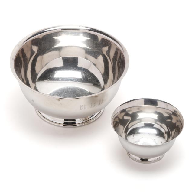 The larger, mark of Baldwin & Miller Inc., pattern number 570, with engraved "MBD" monogram (3 3/4 x 7 1/2 in. dia.); the smaller, mark of Worden Munnis, pattern number 389, not monogrammed (2 3/8 x 4 1/2 in. dia.).