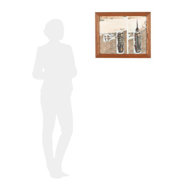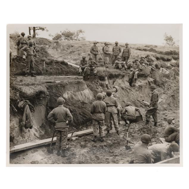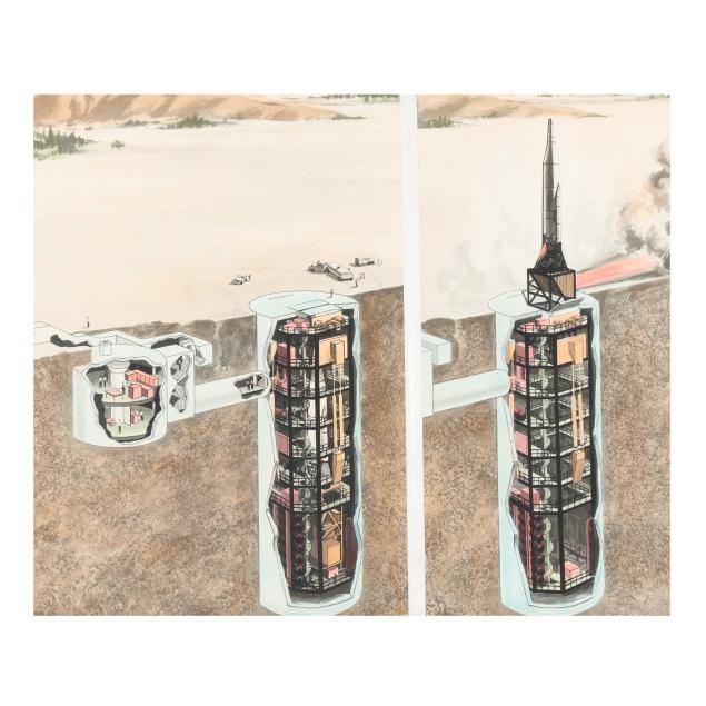 Circa 1960, two printed illustrations adhered together to show a cross-section of a missile silo, with possible hand embellishments, set within beveled wood frame, unsigned (frame 18 3/4 x 22 3/4 x 3/4 in.) and (38) printed black and white photographs showing various scenes of the U.S. Military, several depicting the construction of missile silos, some stamped with date and information to verso (each approximately 8 x 10 in.).