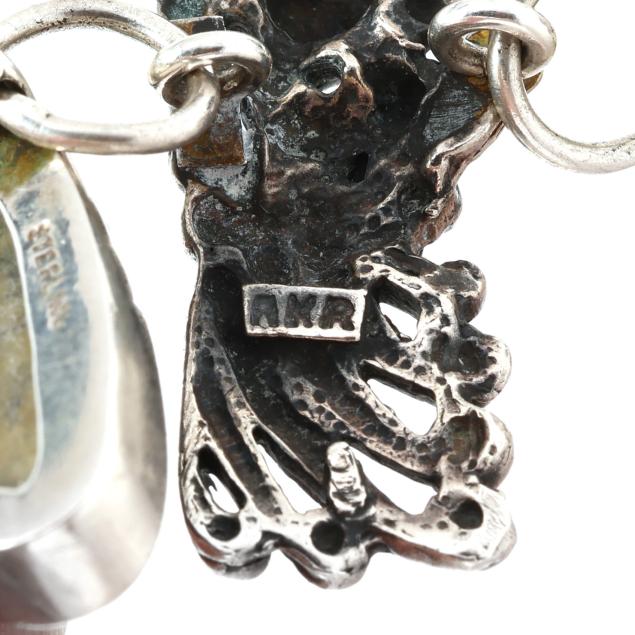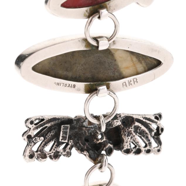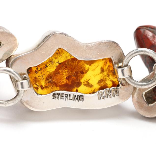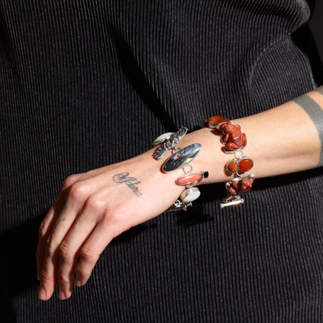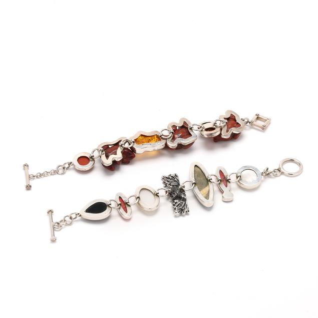 To include: a silver bracelet set with black onyx, coral, mother of pearl, and hardstone, and with a peacock motif link, completed with a toggle clasp, signed and stamped Sterling (39mm x 7.25 in.); and a silver bracelet set with carved jasper in the form of a frog, jasper cabochon, amber, and hardstone, completed with a toggle clasp, signed and stamped Sterling (22mm x 7.25 in.).