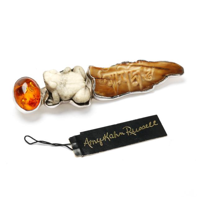 Amy Kahn Russell is a jewelry artist with a BFA from Tulane University whose designs incorporate minerals, pearls, artifacts, and fossils sourced worldwide, sometimes mined and cut to her specifications. She has completed postgraduate studies at Exeter College of Arts in England, LSU, and the University of Houston.