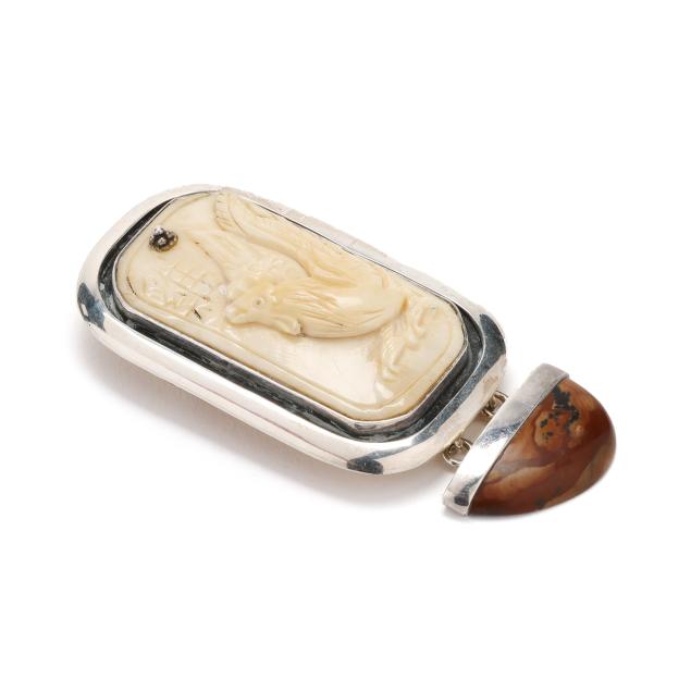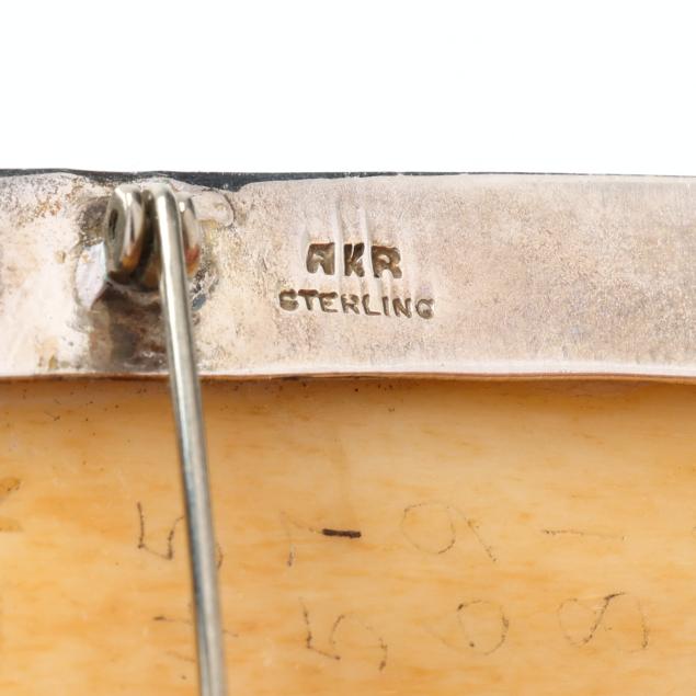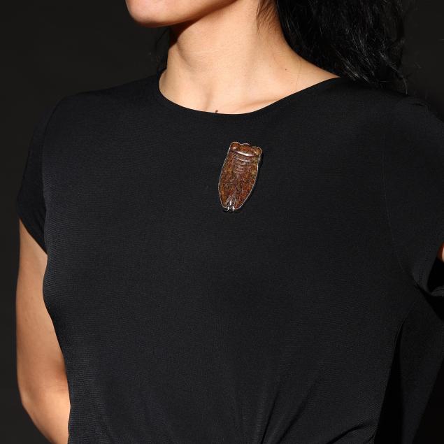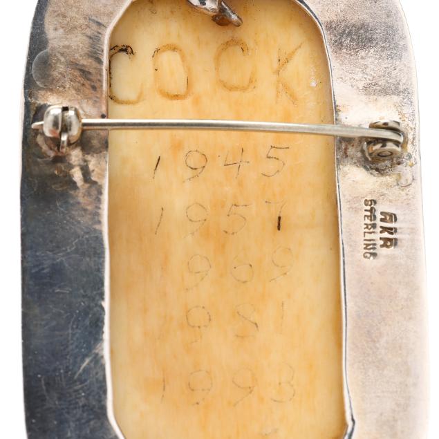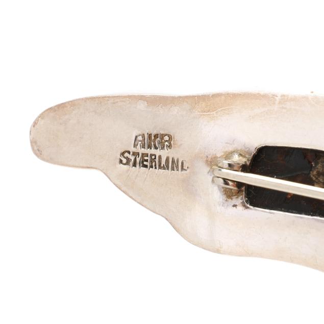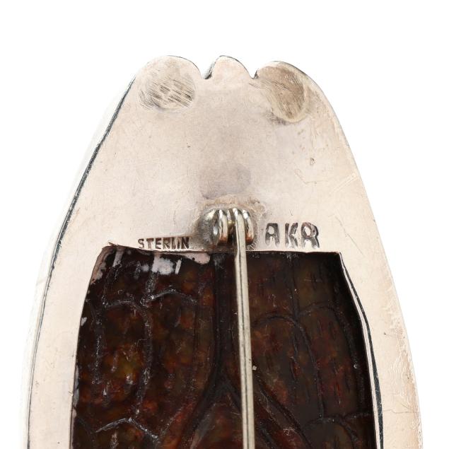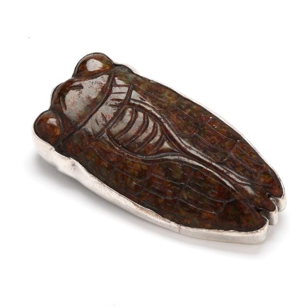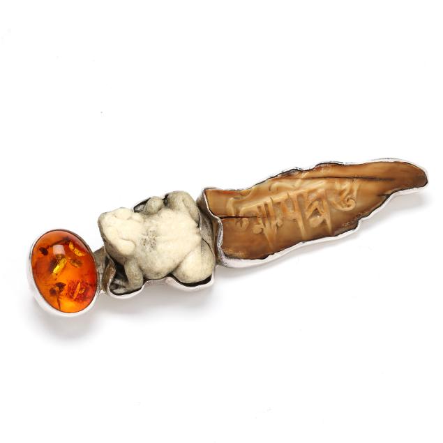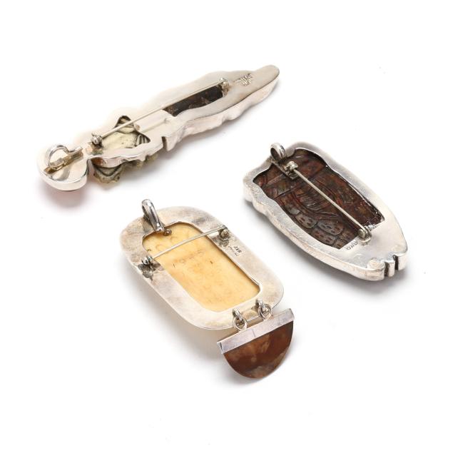 To include: a rectangular silver brooch, set with a carved rooster motif tablet, suspending a jasper drop with silver cap, the back of the tablet engraved with dates corresponding to the Year of the Rooster in the Chinese Zodiac, completed with a locking pin stem and bail, signed and stamped Sterling (3.25 x 1.5 in.); a silver brooch, set with a carved frog, a carved script, and an oval amber, completed with a locking pin stem and bail, signed and stamped Sterling (3.75 x .75 in.); and a carved cicada hardstone brooch, set within a silver conforming surround, completed with a locking pin stem and bail, signed and stamped Sterling (2.5 x 1.25 in.).