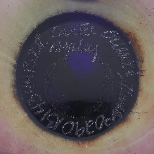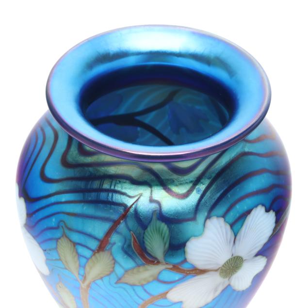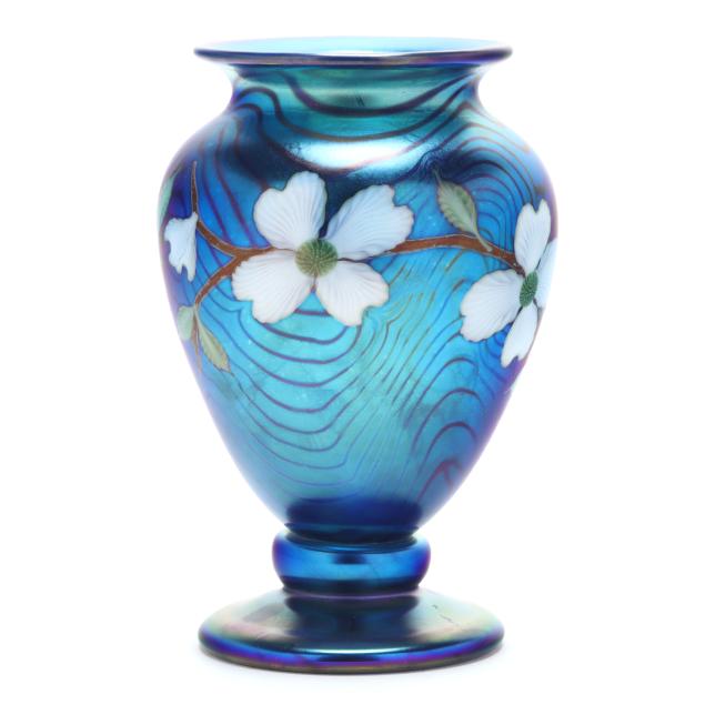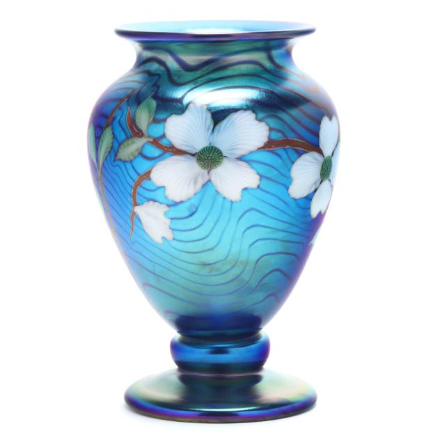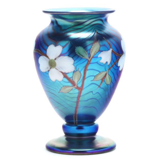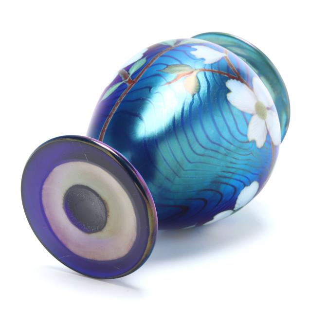 Late 20th century, blown cobalt glass with pulled field and cased dogwood blossoms and branch motifs, polished pontil, signed and with artist's name "Carter Bradley" and production number.