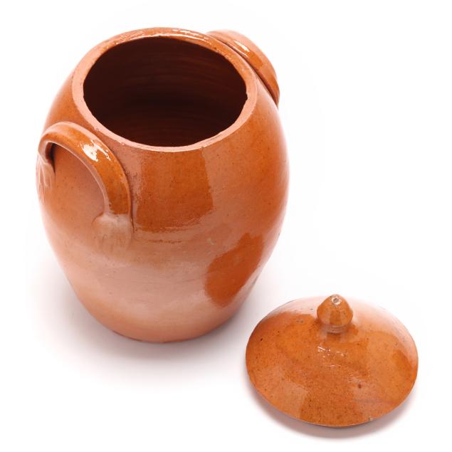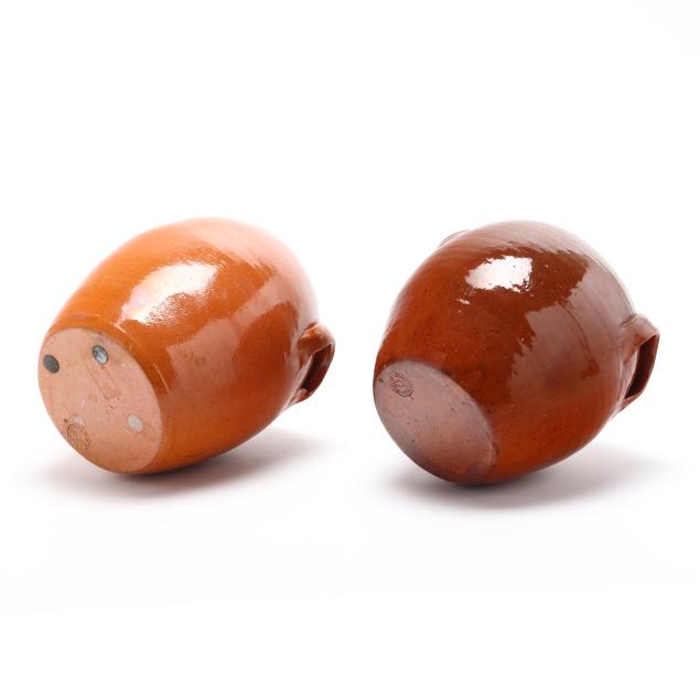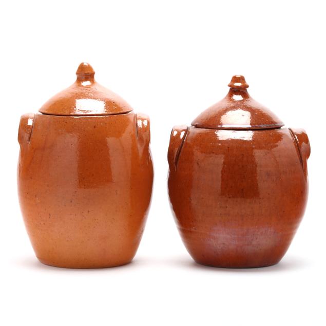 Earthenware lidded jars with two applied lug handles, the first a 1960-1972 jar, with Owen's master potter stamp to underside (11 1/4 x 8 x 8 in.), the second a late-20th-century Jugtown jar with Jugtown Ware stamp to underside (10 3/4 x 8 x 8 in.).