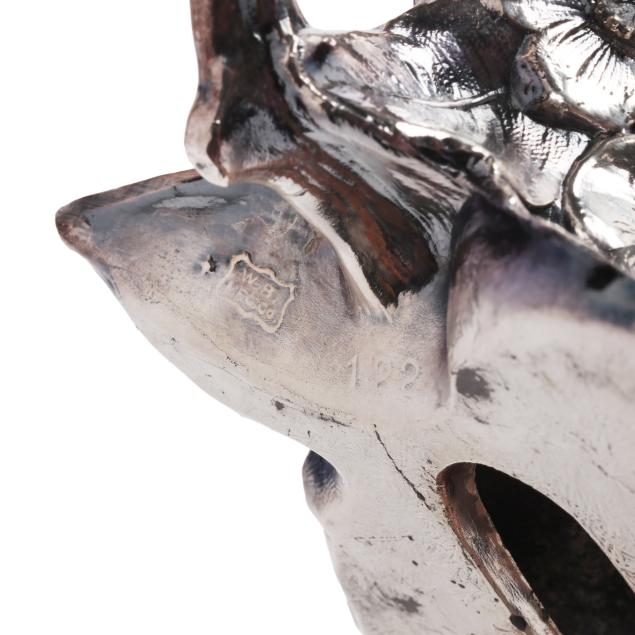 The centerpiece likely missing (2) smaller trumpet vases; loss to the base of one bird, not retaining stoppers.