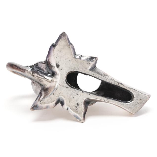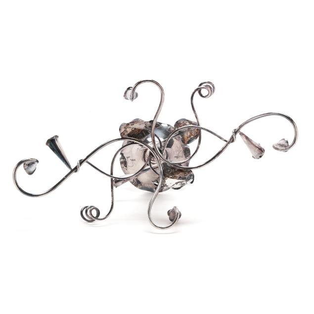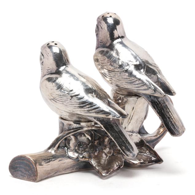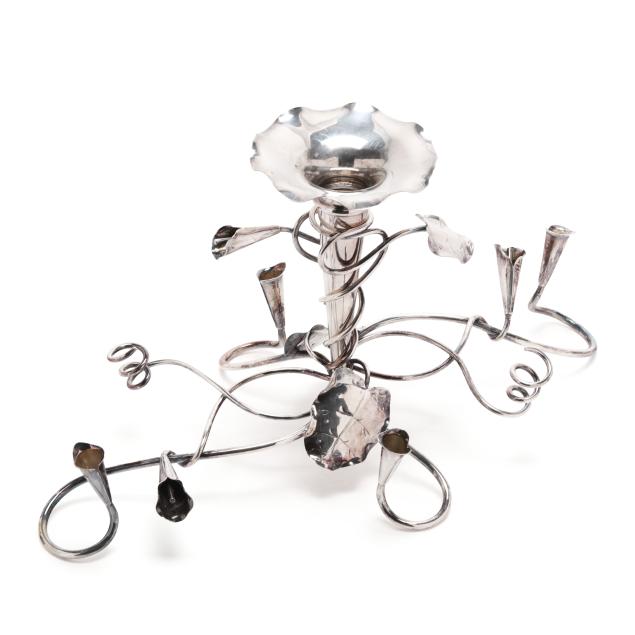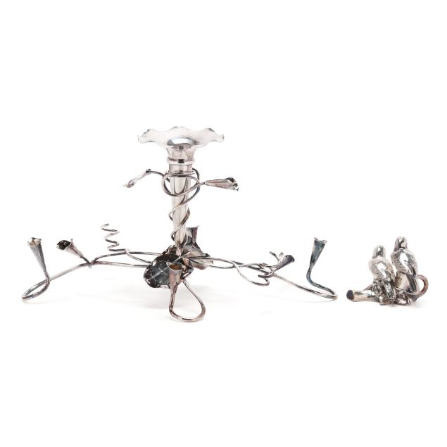 The first, an English silver-plated centerpiece with central trumpet vase and foliate form base with candleholders, mark of Mappin & Webb, two-part form (10 x 20 x 10 in.); and a vintage pair of silver-plated salt and pepper shakers in the form of birds on a branch, mark of Weidlich Brothers Manufacturing Co. three-part form (4 x 5 x 4 in.); neither monogrammed.