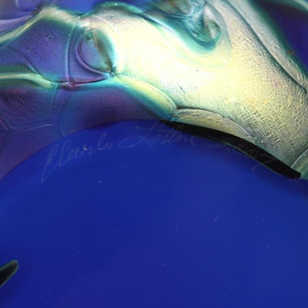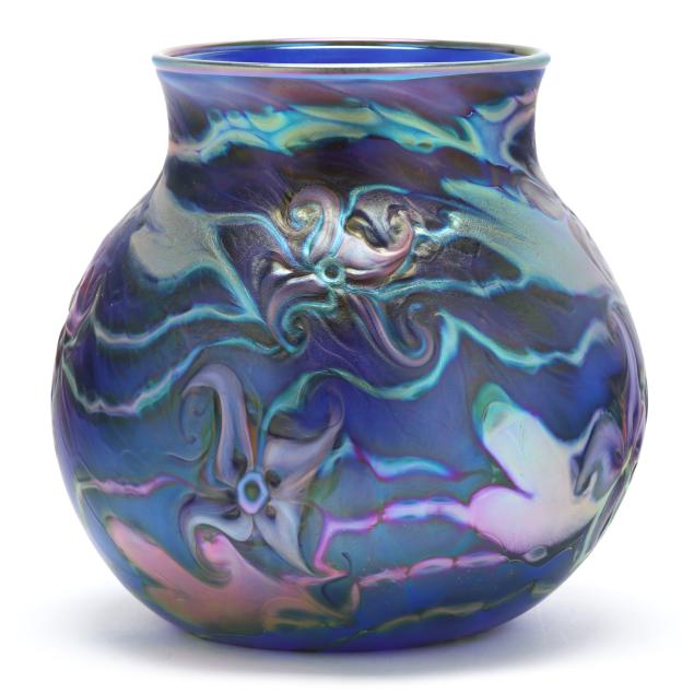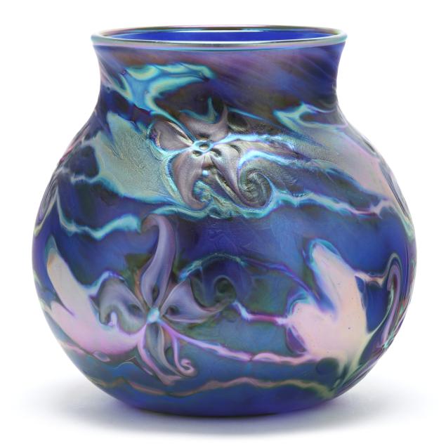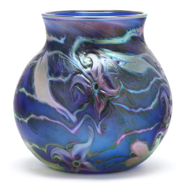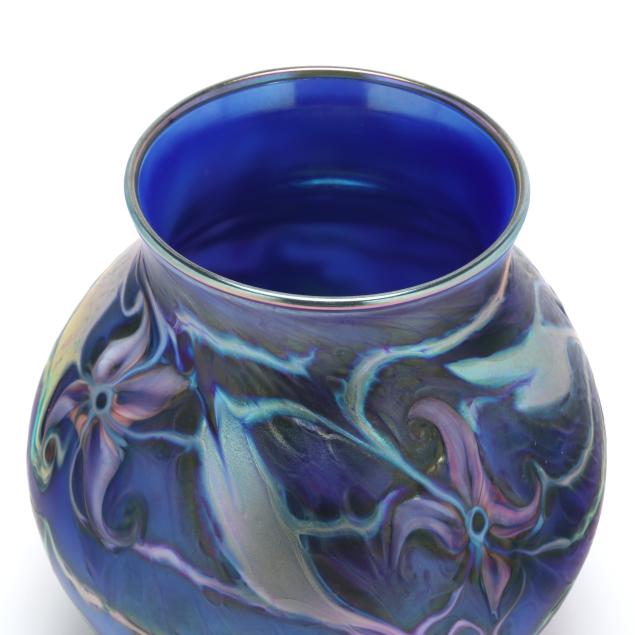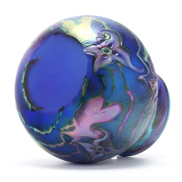 2007, blown cobalt glass with iridescent surface and tooled floral motifs with hues of green, purple, and peacock blue, polished base, signed.