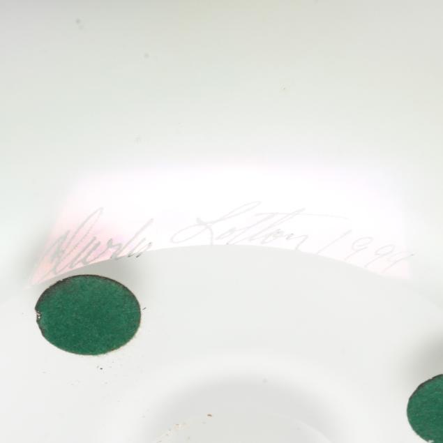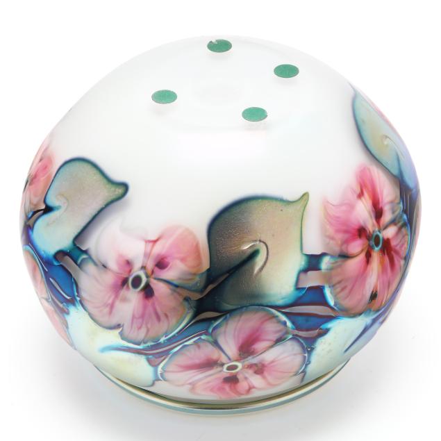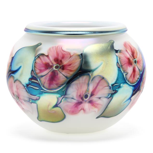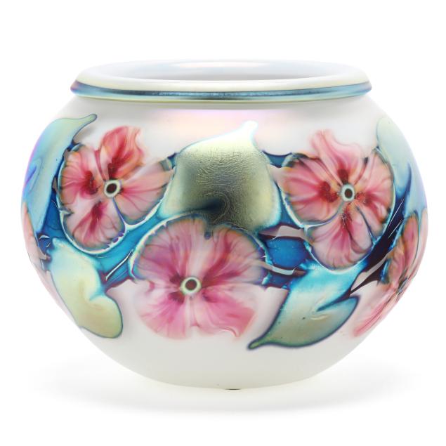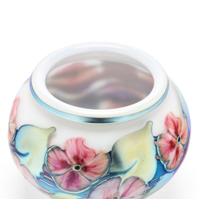 1999, blown white glass with iridescent surface, pink flowers with green-blue leaves, polished base, signed.