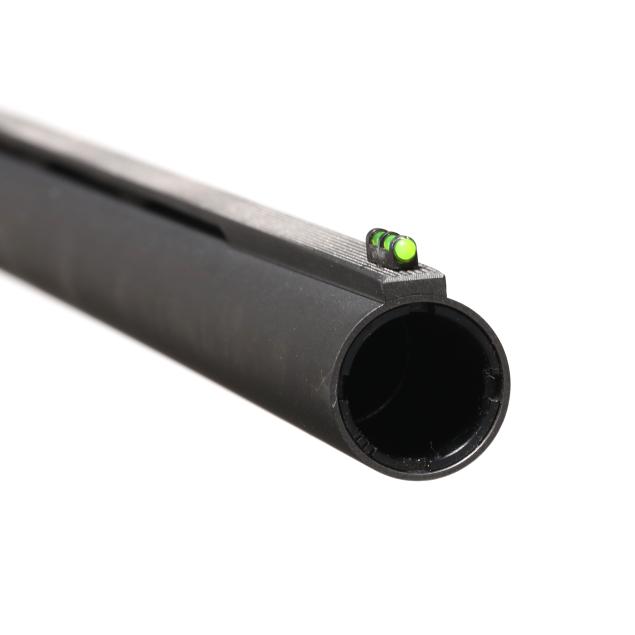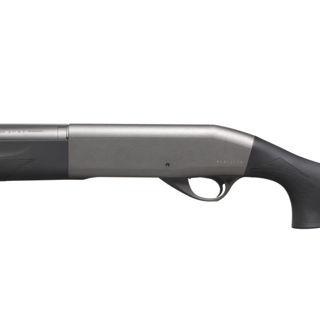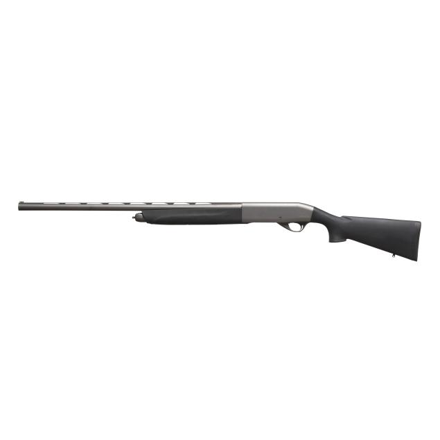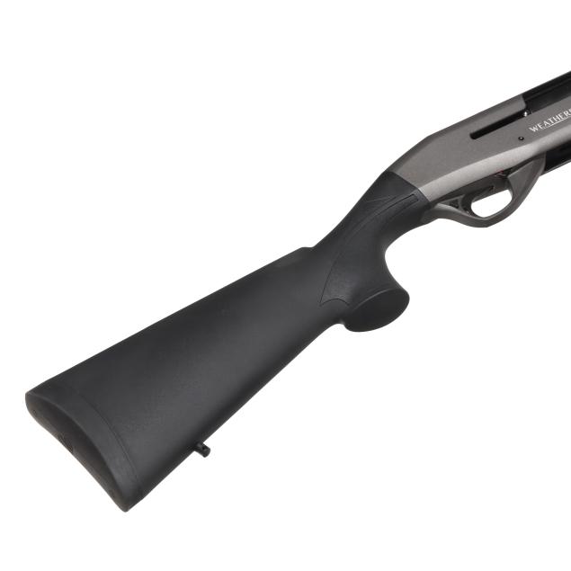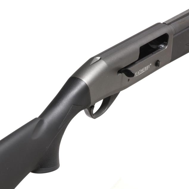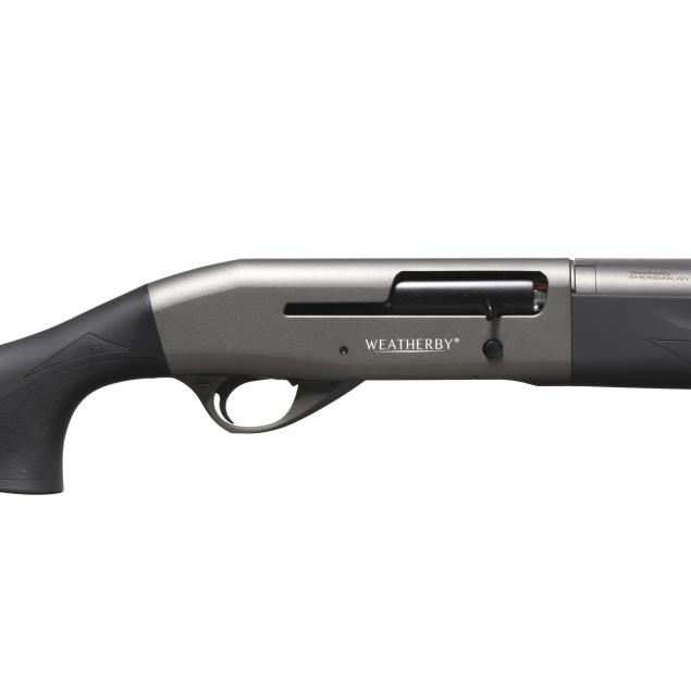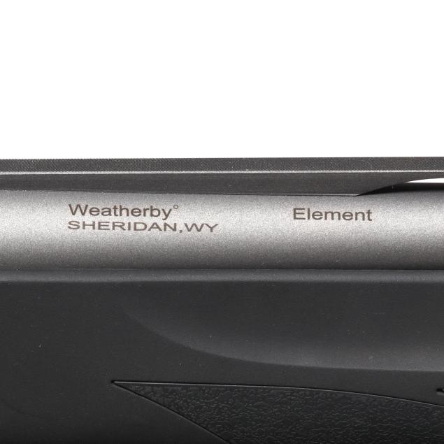 Serial number RL022558 present on rear left side of semi-automatic receiver, text of WEATHERBY present on right side of receiver, text of ELEMENT and WEATHERBY SHERIDEN WY present on 28 in. vent rib barrel with fiber optic front bead, manual safety, sling studs, black composite buttstock and forend.