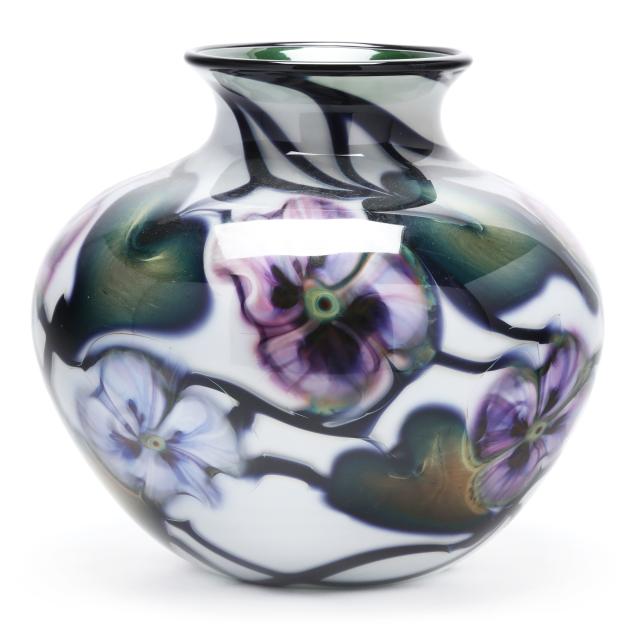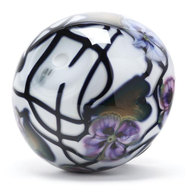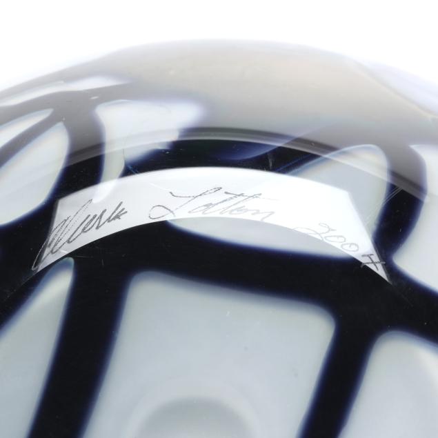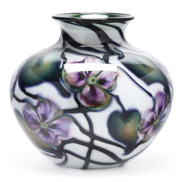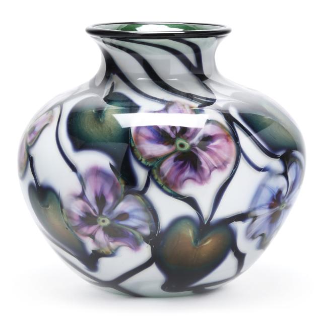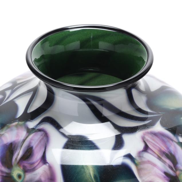 2004, blown white glass with interior in emerald green aventurine, the exterior with purple blossoms, leaf and vine motifs, polished underside, signed.