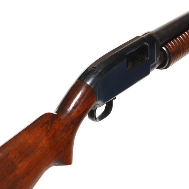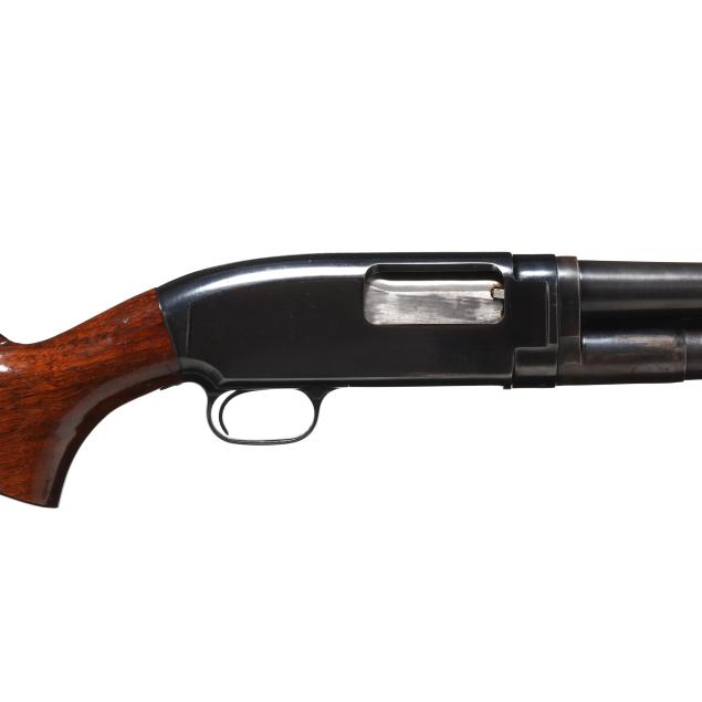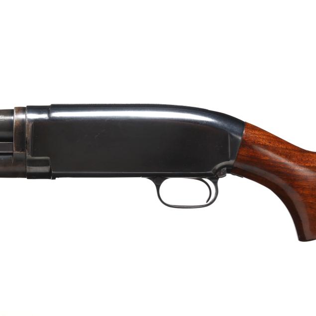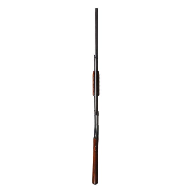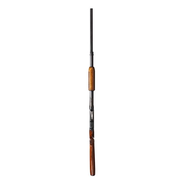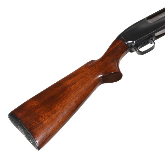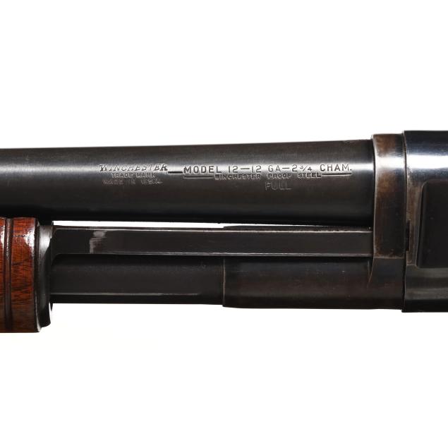 Serial number 1226767 present on belly of blued pump-action receiver and barrel assembly, text of WINCHESTER MODEL 12 12GA 2 3/4 CHAM. and FULL present on 30 in. blued ribless barrel with front bead, manual safety, smooth walnut pistol grip buttstock with factory buttplate, ribbed walnut forend.