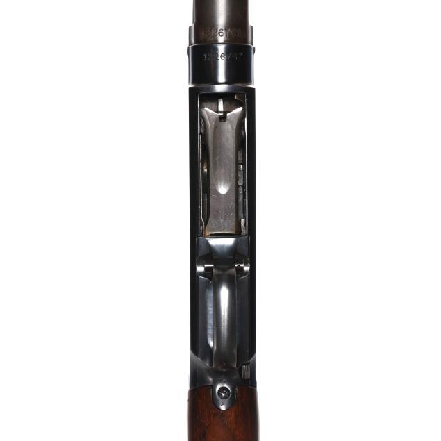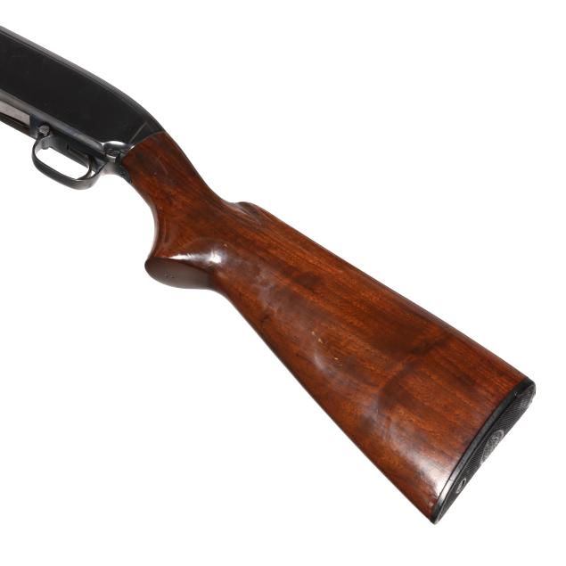Overall good estate condition, blued surfaces show consistent field marks throughout with more bluing wear on the magazine tube area of the barrel assembly, bore is bright and shiny, new higher gloss finish was added to the stock and forend at some point as evidenced by sheen and drip lines.