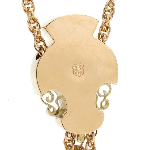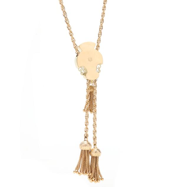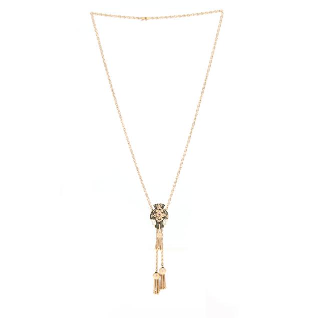 The gold slide with black enameling, scrolled motif, and a bezel set synthetic ruby, suspending a tassel, on a gold rope twist necklace with textured links completed with a box clasp with trefoil motif and figure eight safety, and with tassels to terminals, stamped with a maker's mark and 14K.