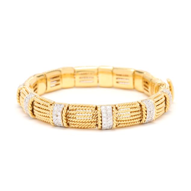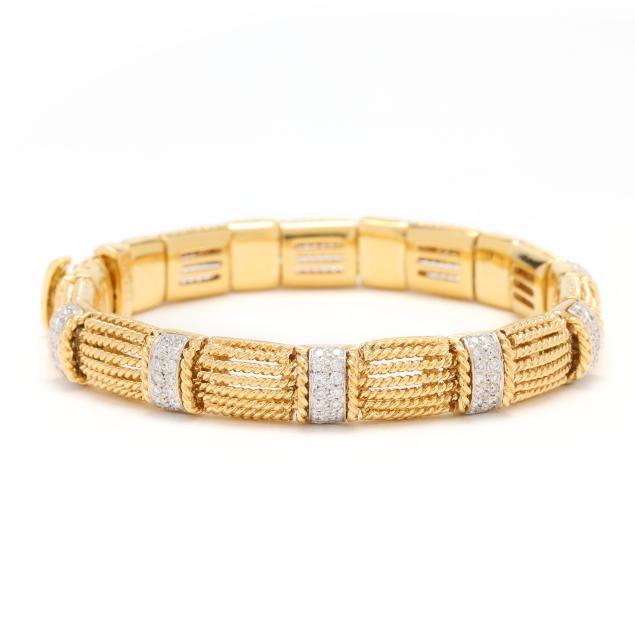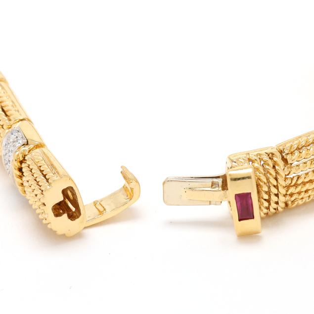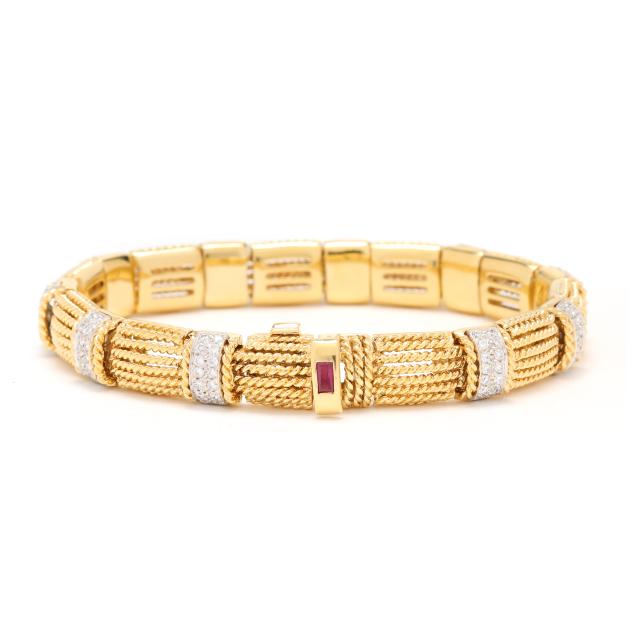 Appassionata collection, rectangular rope twist links alternating with stations with rope twist detail and set with full cut round diamonds weighing approximately 1.40 total carats (F-G color, VS1-VS2 clarity), completed with an integrated box clasp set with a fold under safety, with a straight baguette cut ruby, with maker's mark, stamped Italy / 18Kt and with Italian registry mark 1228 VI.