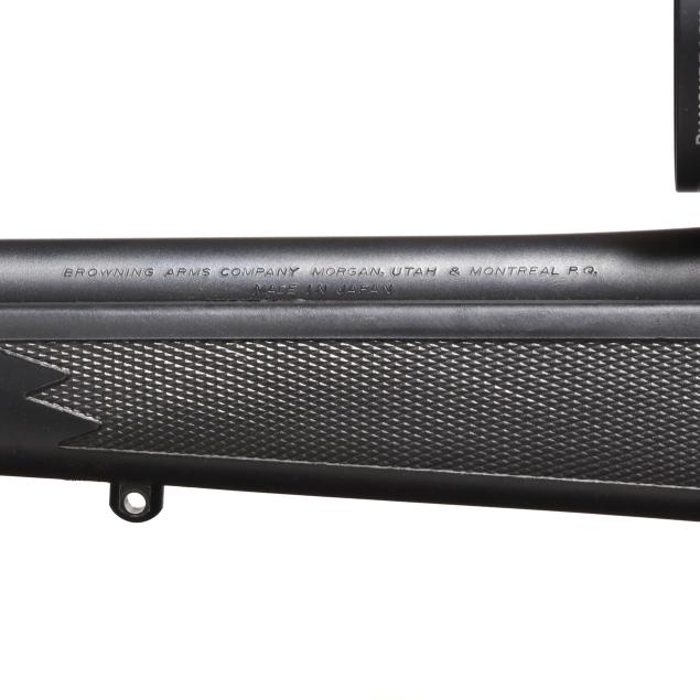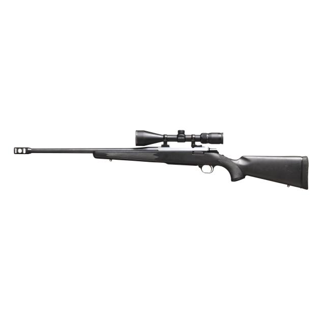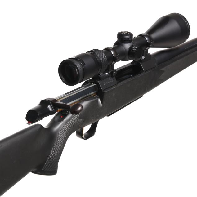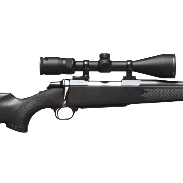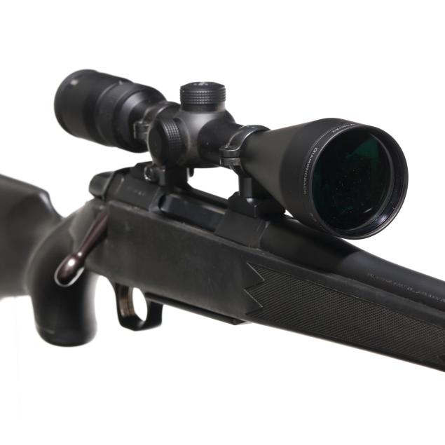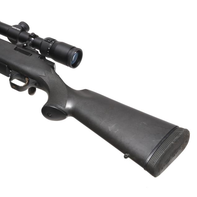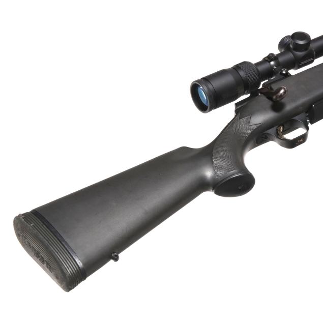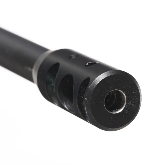 Overall good estate condition, matte blued surfaces are healthy with one small finish blemish along right side of barrel near muzzle brake, bore is slightly dusty with sharp rifling, clear view through scope with crisp reticle, moderate scope ring screw slot damage, scattered light field marks present on composite stock, checkering sharp, recoil pad shows some deformation and has become somewhat sticky.