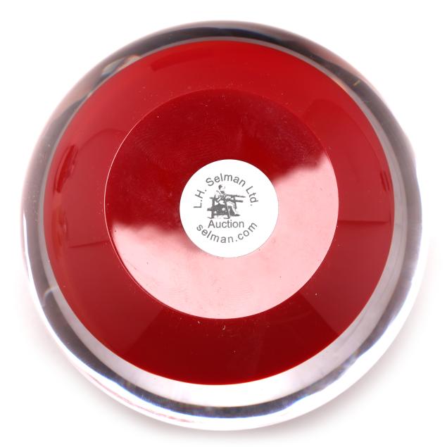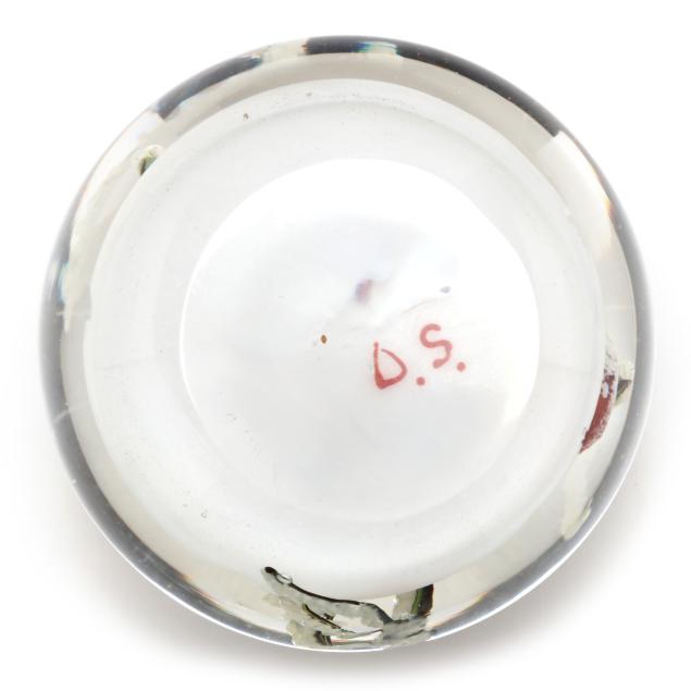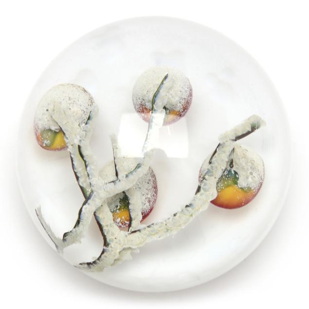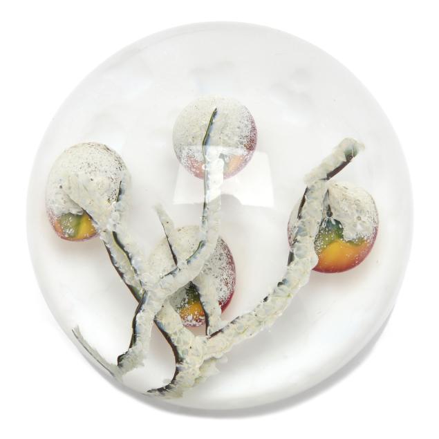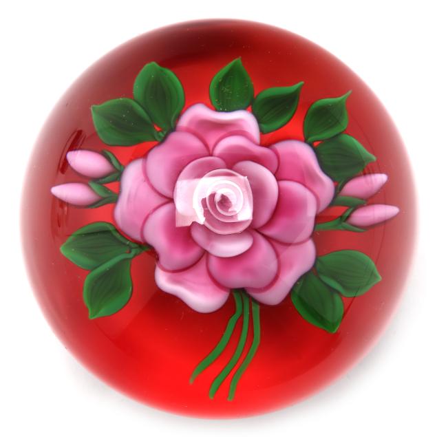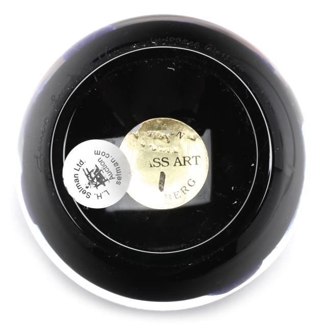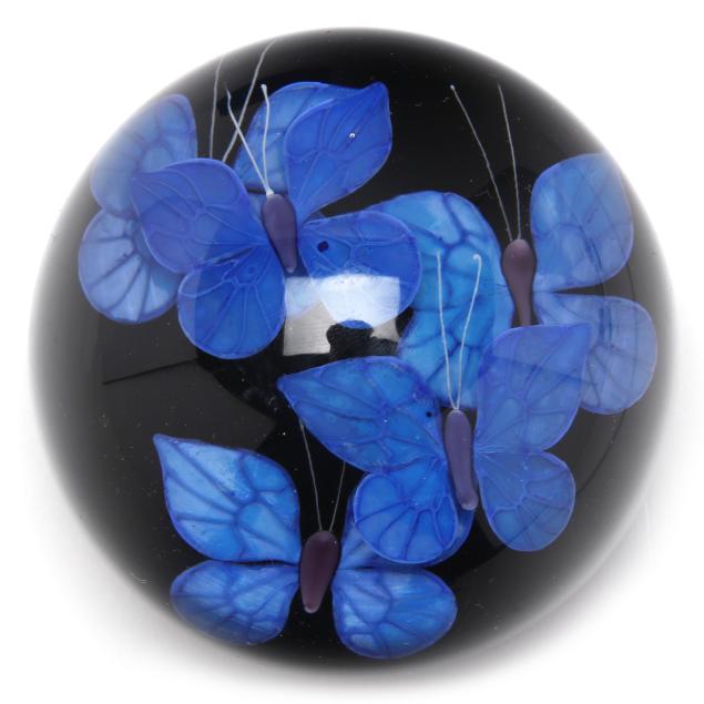 Including a David P. Salazar, Lundberg Studios 2007 snowy peach branch paperweight (3 x 4 in. diameter); a Steven Lundberg 1999 blue butterfly paperweight (2.75 x 3.25 in. diameter); a Victor Trabucco 1987 pink rose over red field paperweight (2.5 x 3.25 in. diameter); and a Ken Rosenfeld 2012 lamp work floral bouquet over teal field paperweight (3 x 3 in. diameter), all signed.