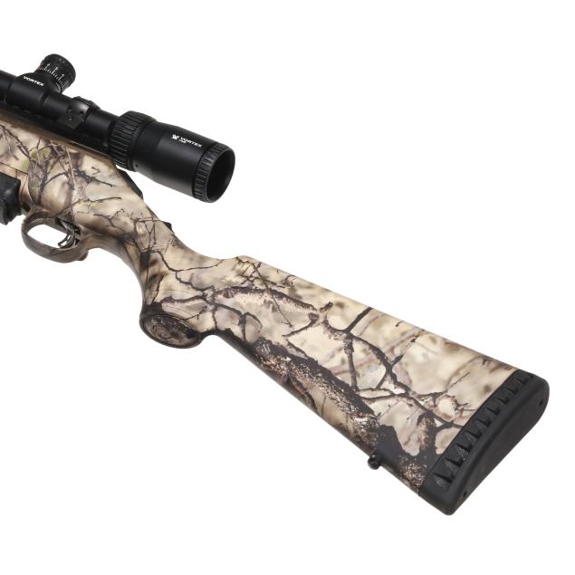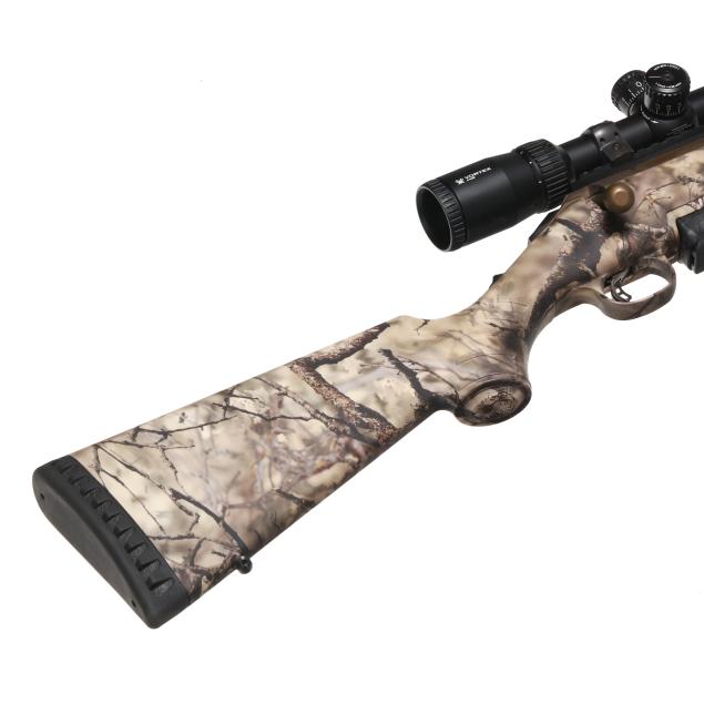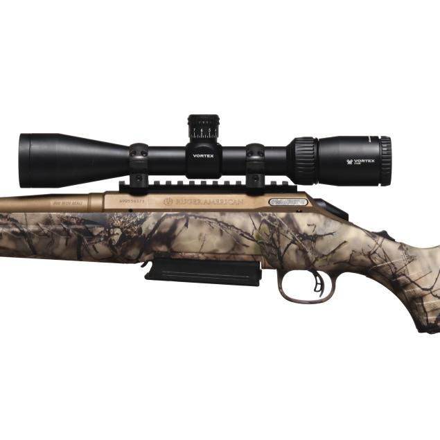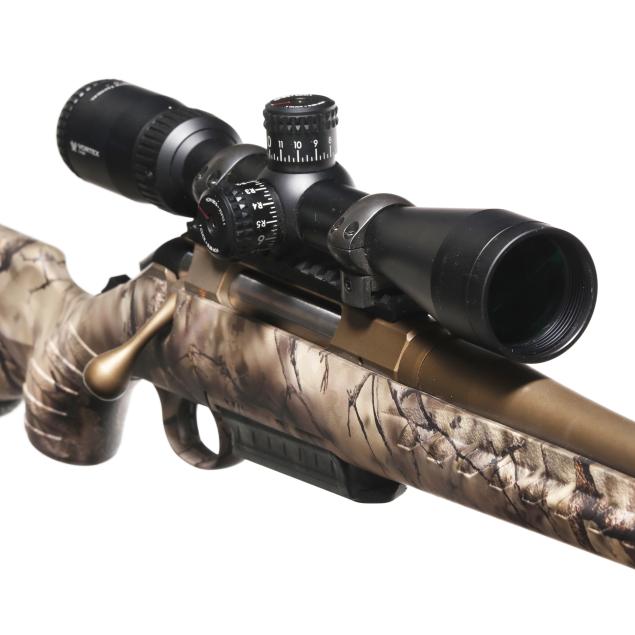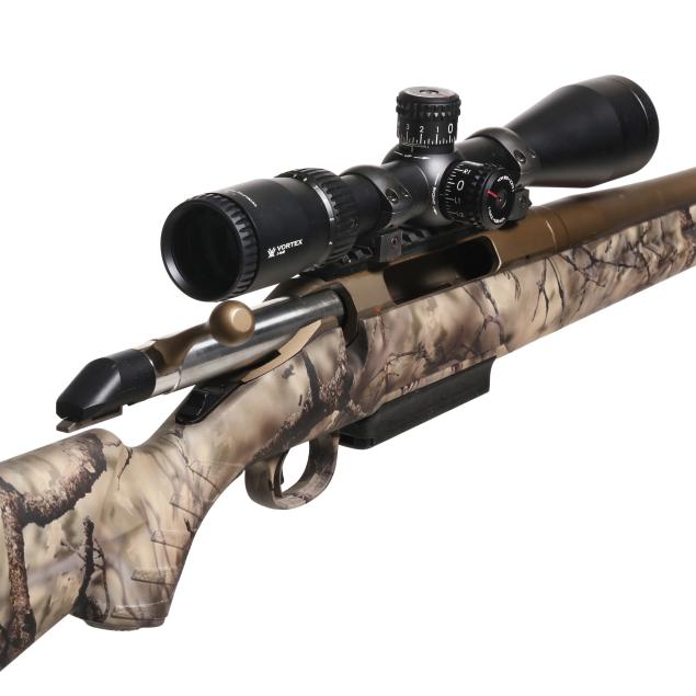 Serial number 690550371 present on bronze CERAKOTE bolt-action receiver, text of 300 WIN MAG present on 25 in. bronze CERAKOTE barrel with muzzle brake, manual safety, detachable box magazine, sling swivel studs, picatinny rail with scope rings, VORTEX DIAMONDBACK TACTICAL 3-9x40 scope, GO WILD camouflage composite stock with factory recoil pad.
