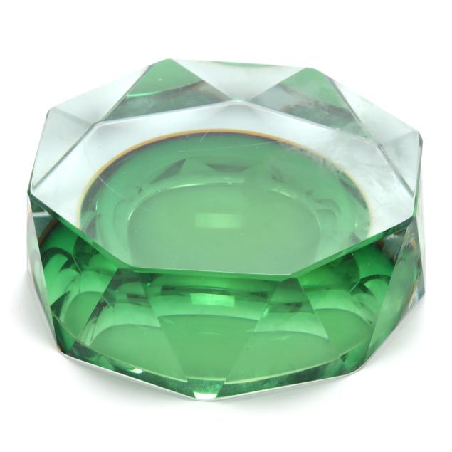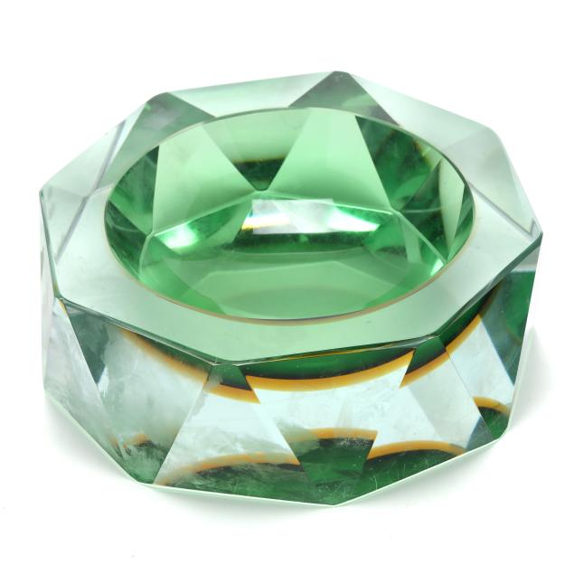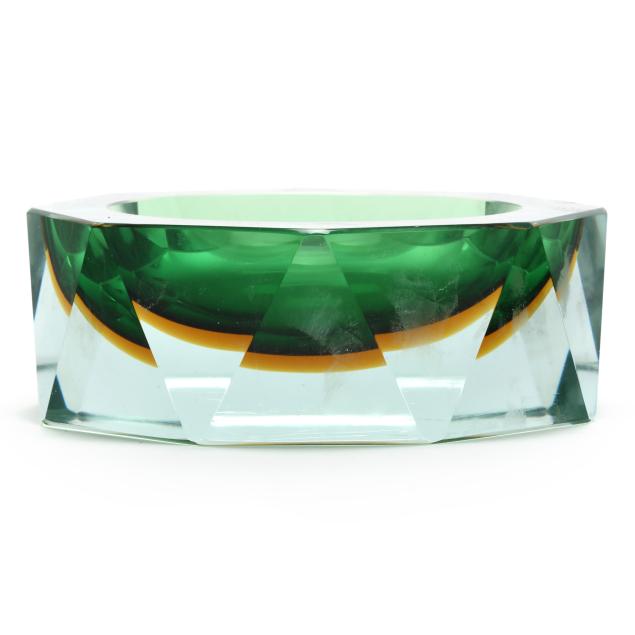 Circa 1960, amber over green cased glass basin with faceted side panels, unmarked.