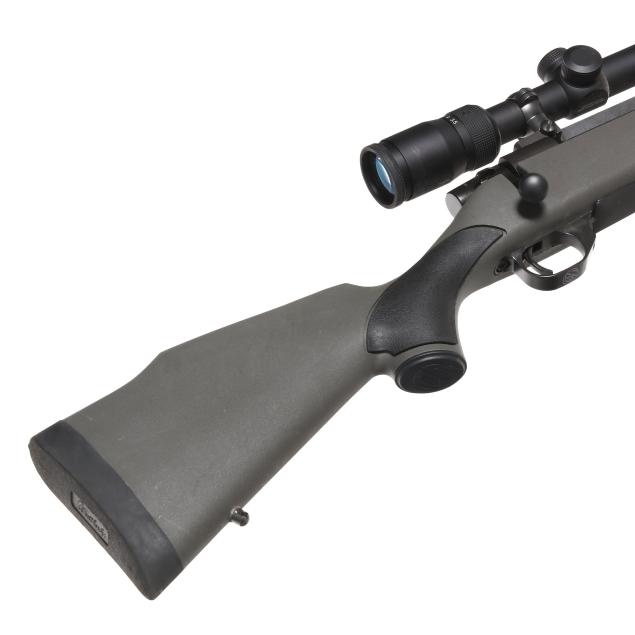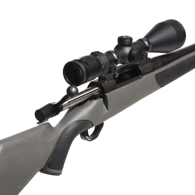 Overall very good estate condition, blued surfaces are dark and healthy, bore slightly dusty with crisp rifling, composite stock shows only light scuffing more so from residence in a safe than actually use afield, view through scope is clear with a sharp reticle.