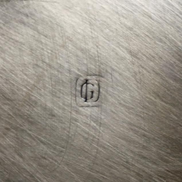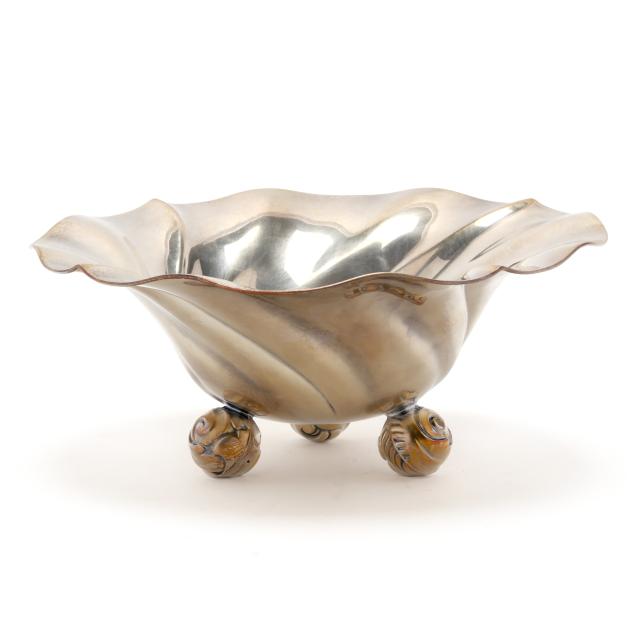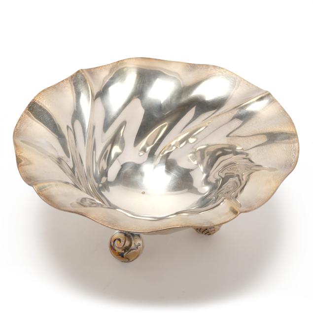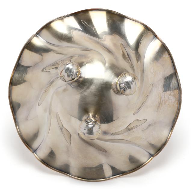 Mid-20th century, round footed bowl in flared swirl petal form, with three scrolled ball feet, unidentified "DG" maker's mark to the underside.
