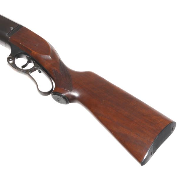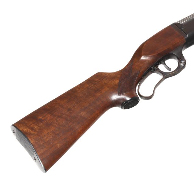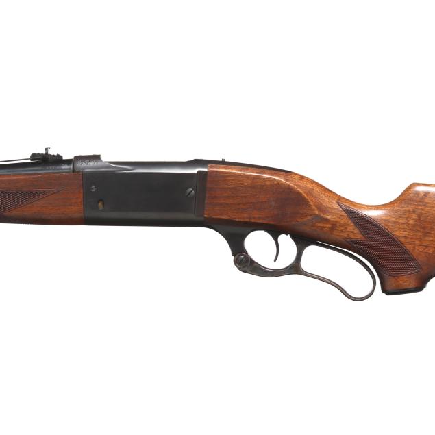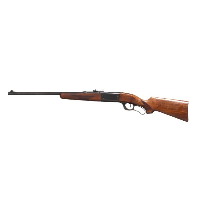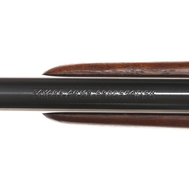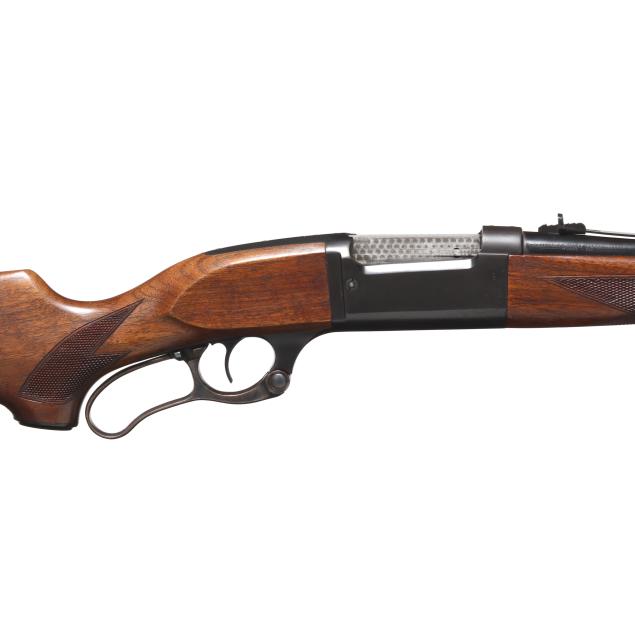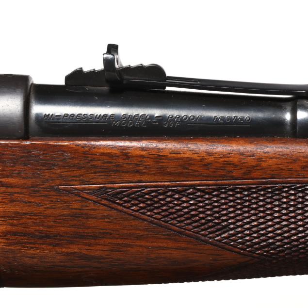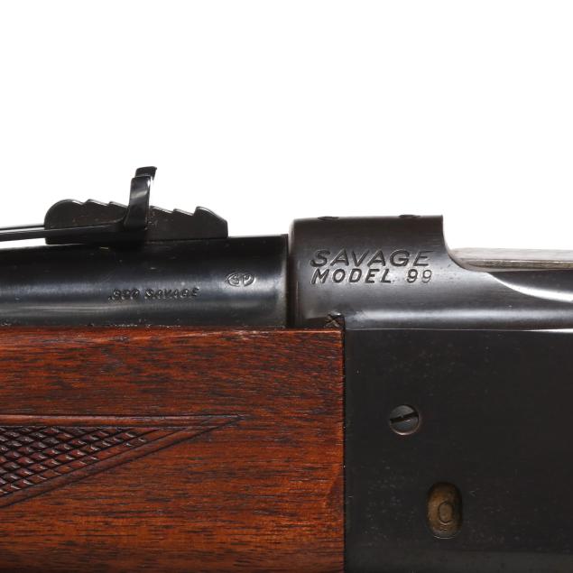 Serial number 772701 present on belly of lever-action receiver forward of lever, text of SAVAGE MODEL 99 on barrel hood of receiver, text of .300 SAVAGE and HI-PRESSURE STEEL PROOF TESTED MODEL - 99F present on 22 in. barrel with dovetail rear sight with elevator and ramped front sight, jeweled bolt, manual safety, cocking indicator, brass round count indicator, factory drilled and tapped for scope mounting, color cased lever, checkered capped pistol grip walnut buttstock with factory lined steel buttplate, checkered walnut forend.
