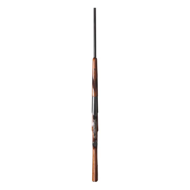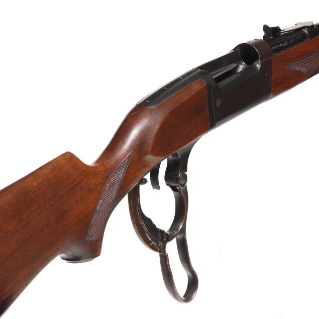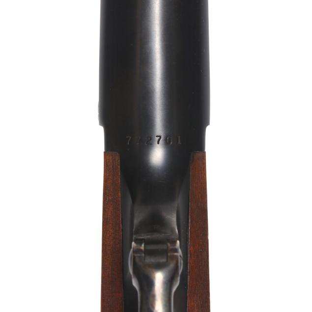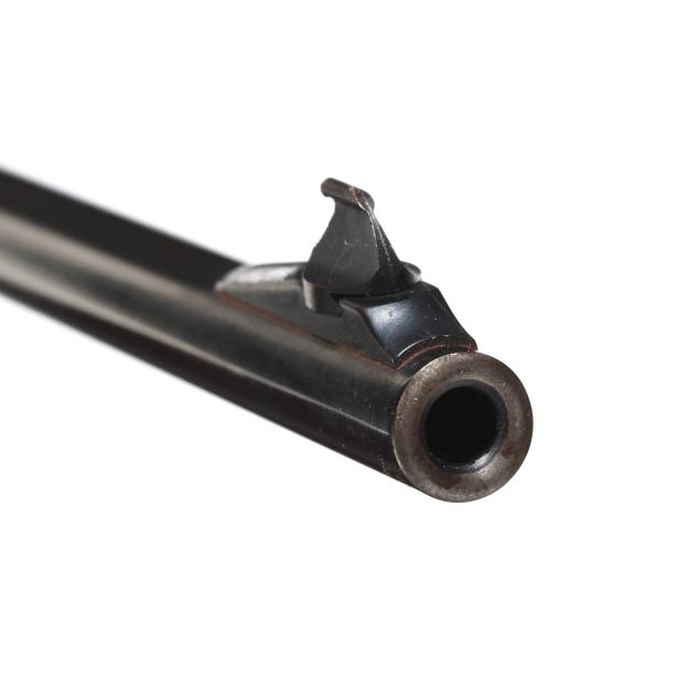 Overall very good estate condition, blued surfaces are healthy with light speckled surface rust covering belly of receiver, bore and rifling are clean and bright, color casing colors on lever remain discernible, stock finish somewhat porous but uniform and healthy, checkering remains sharp and articulate.