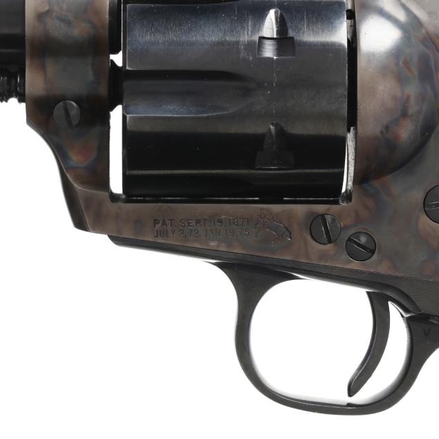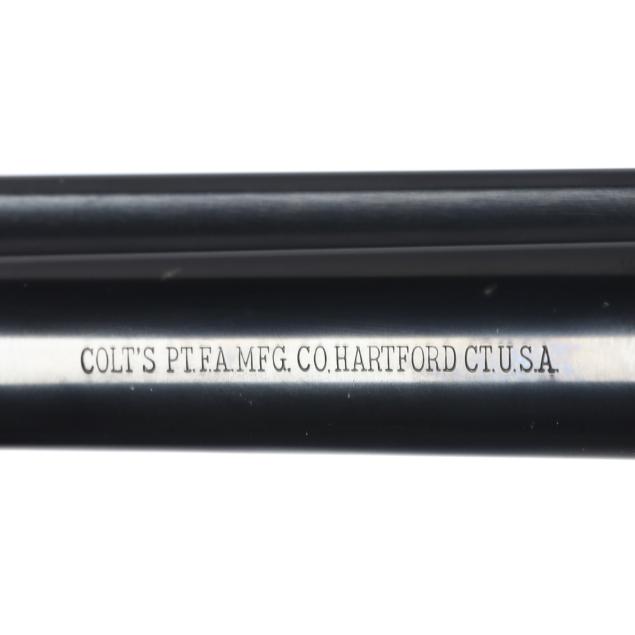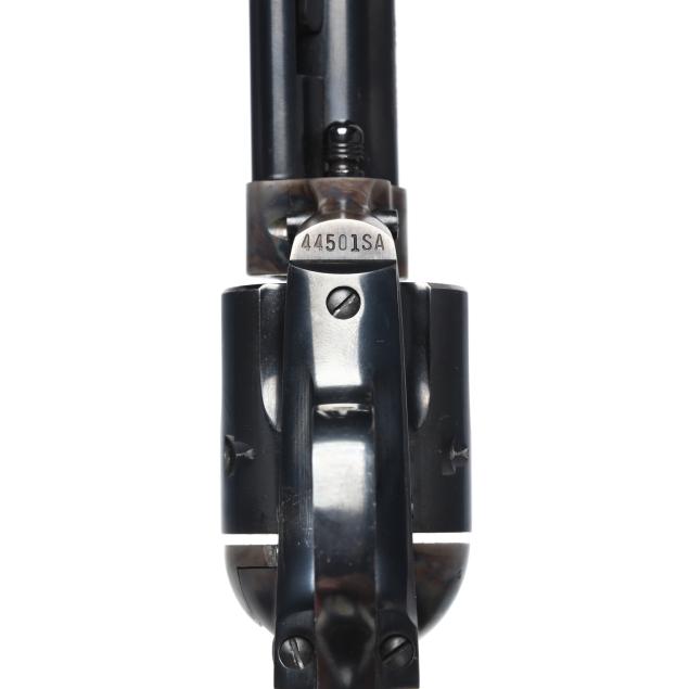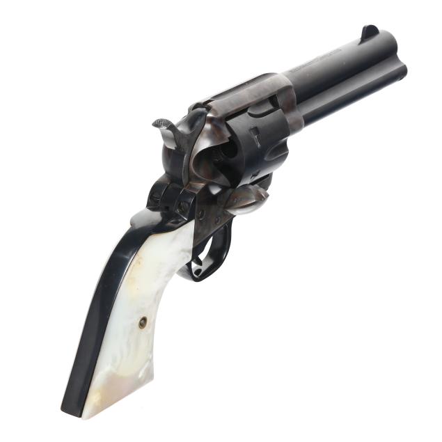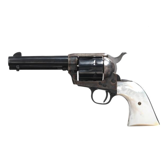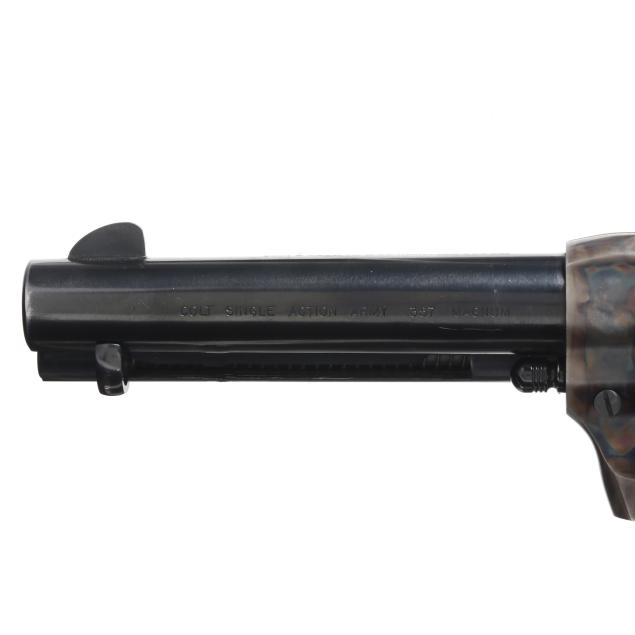 Serial number 44501SA present on underside of color cased frame, text of COLT SINGLE ACTION ARMY .357 MAGNUM present on left side of blued 4 11/16 in. barrel with blade front sight, blued front and back straps, blued cylinder, genuine mother-of-pearl grip scales.