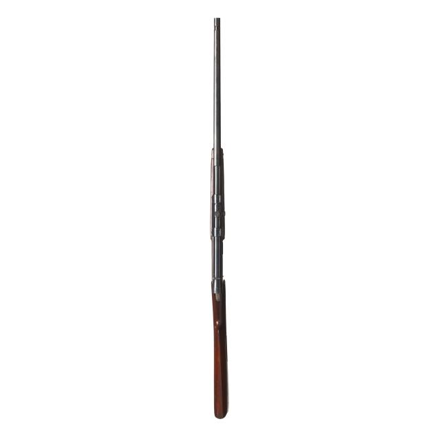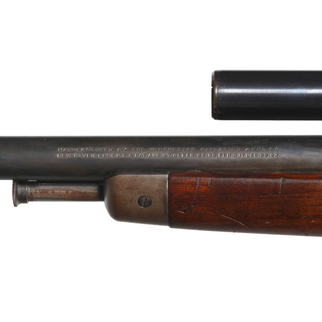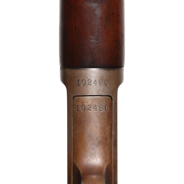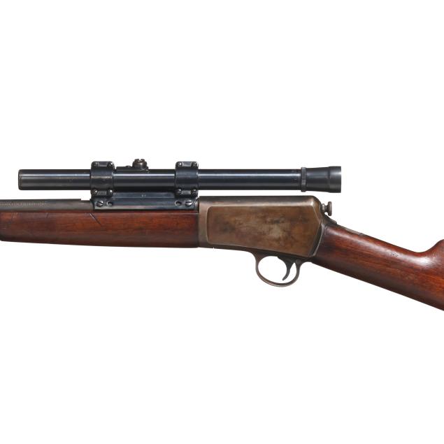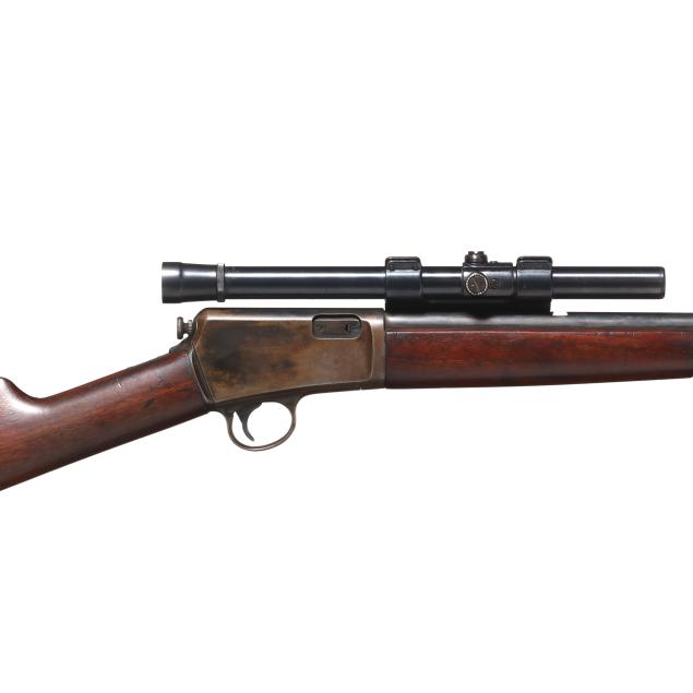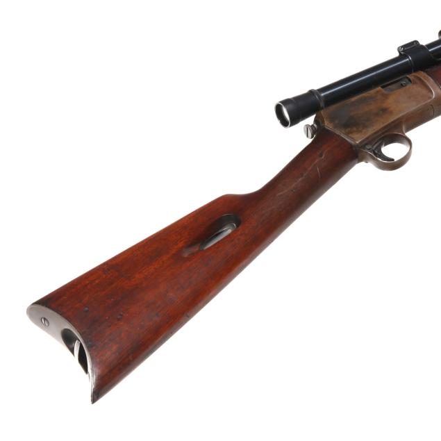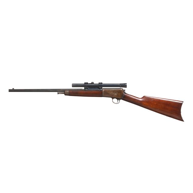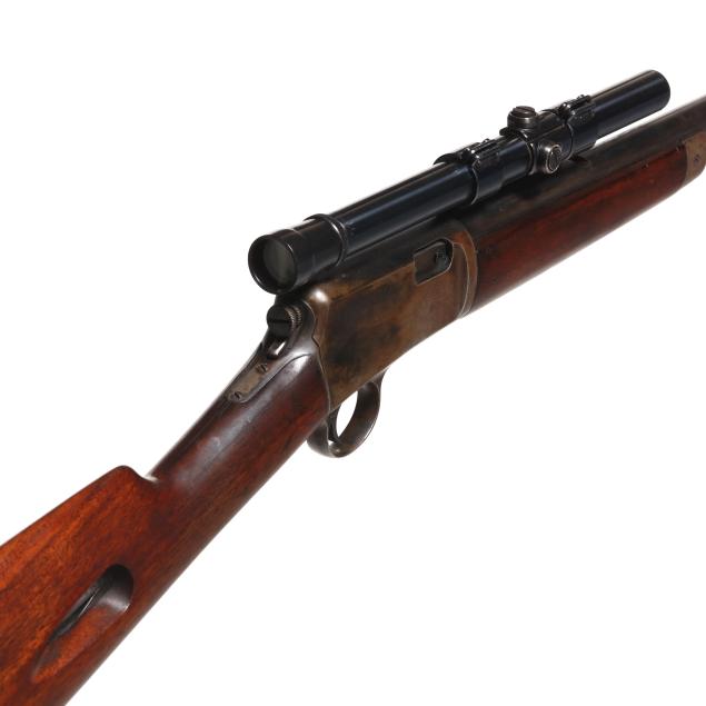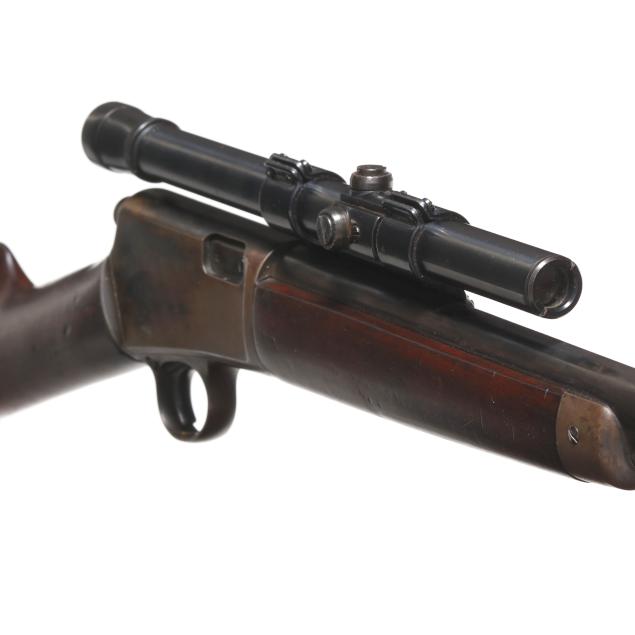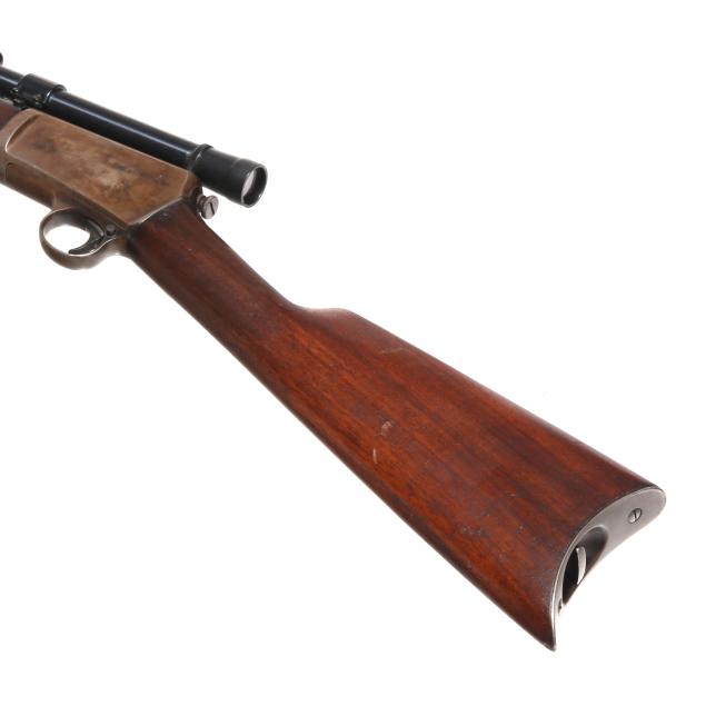 Serial number 102480 present on belly of semi-automatic action receiver and trigger assembly, 20 in. barrel with dovetail front sight and empty dovetail slot for rear sight, WEAVER B4 scope mounted to side of barrel, manual safety, smooth walnut buttstock and forend, curved steel factory buttplate.